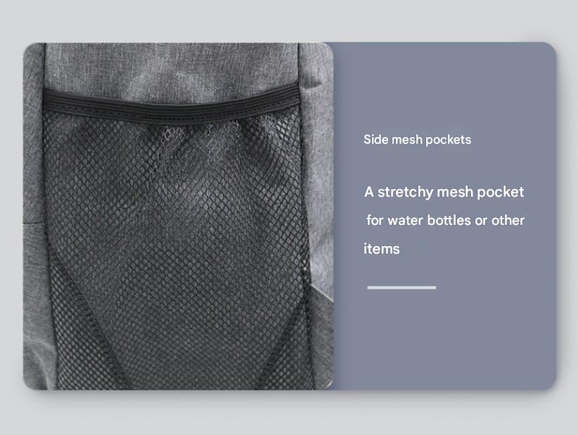 • Two elasticated side mesh pockets, ideal for water bottles, umbrellas, or snacks.