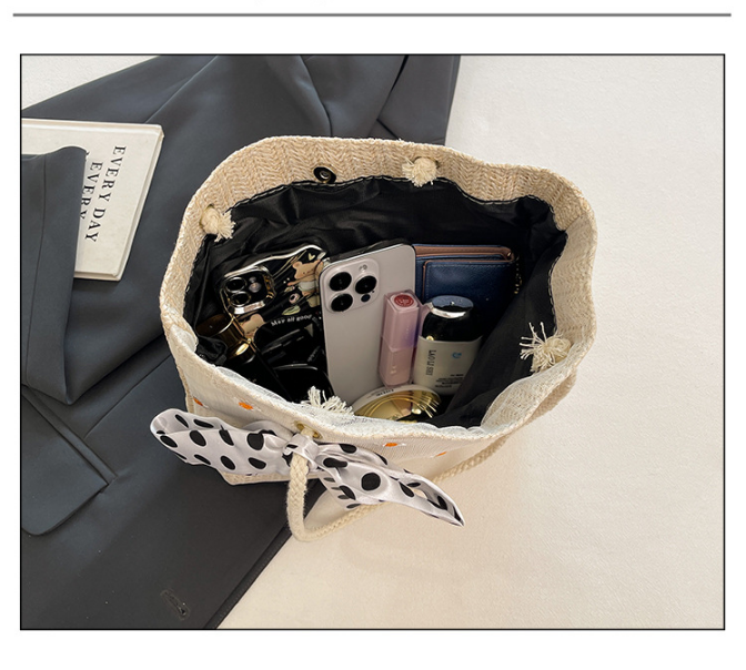 Embrace the summer vibes with this stylish straw woven tote bag, a perfect accessory for sunny days, beach trips, and casual outings. Crafted from high-quality woven fabric in a versatile khaki tone, this bag features delicate daisy embroidery that adds a fresh and youthful touch. Complete with a chic polka-dot ribbon scarf tied to the handle, it blends fashion with function for the modern woman.