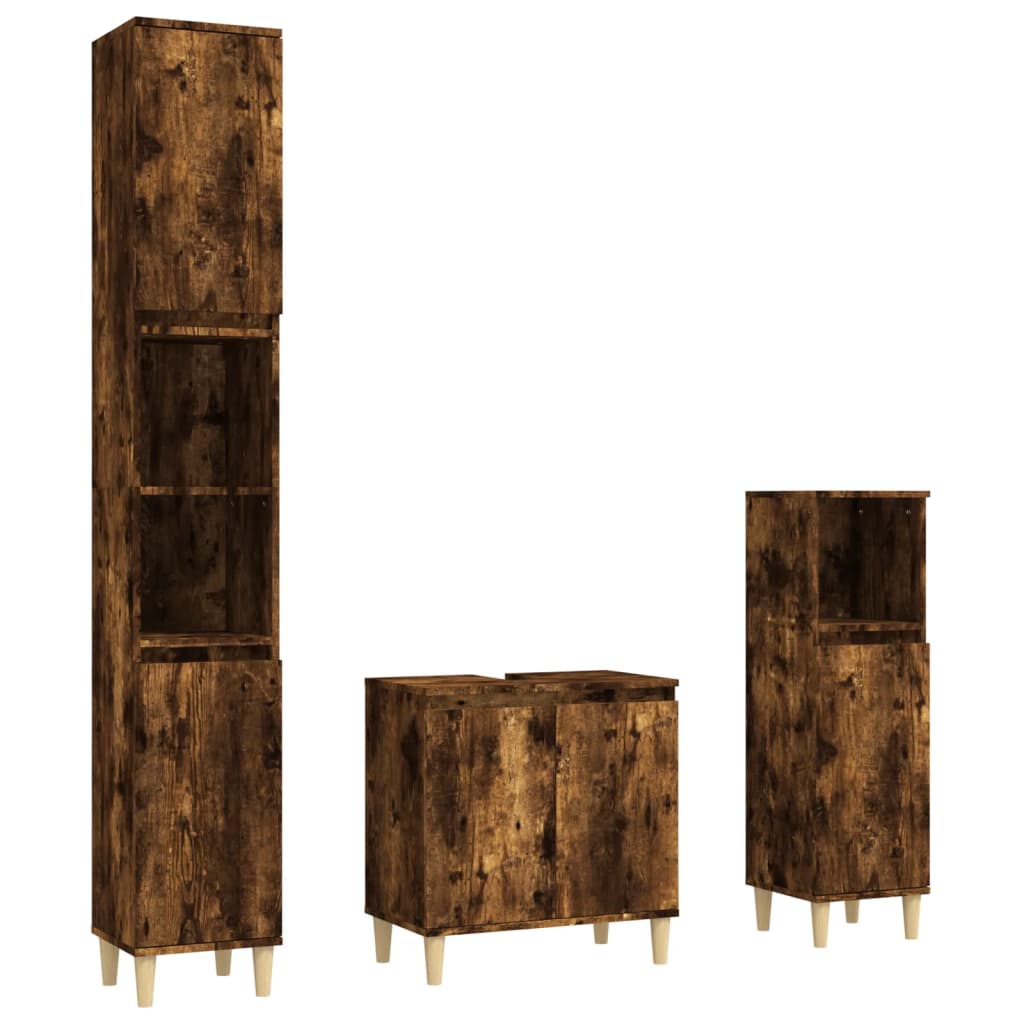 This stylish bathroom furniture set, featuring spacious storage space, is an excellent addition to your bathroom, giving it a tidy and striking appearance! Durable material: The engineered wood is of exceptional quality with a smooth surface and features strength, stability and resistance to moisture.Ample storage space: These bathroom cabinets offer ample storage space for keeping your bathroom supplies well organised.Wooden feet: The solid eucalyptus wood feet give the bathroom furniture a natural and pleasant look while ensuring stability.Easy-to-clean surface: The bathroom unit is easy to clean with a damp cloth.Stylish design: The clean lines and sleek design blend into your bathroom perfectly. Warning:To prevent it being overturned, this product must be used with the provided wall attachment device. Good to know:Screws and plugs for inside the wall are not included. We advise to find and use screws and plugs suitable specifically for your walls. If you're not sure, you can consult with a professional. Please read and follow each step of the instructions.