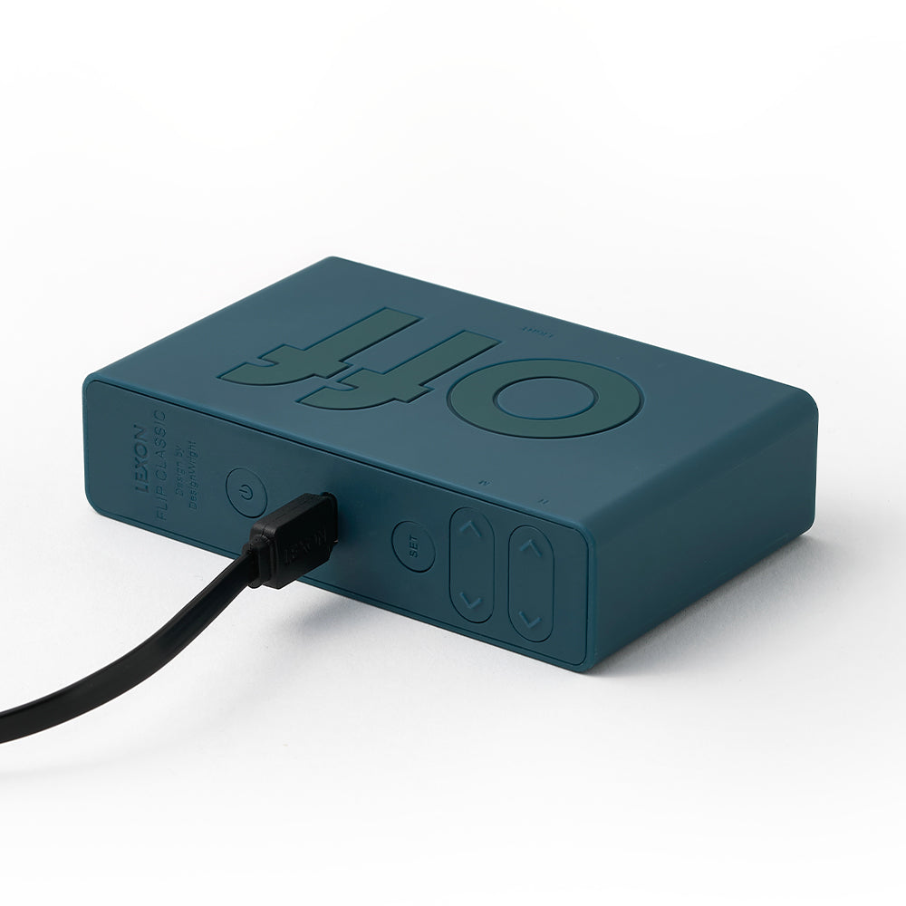 Lexon Flip Classic Reversible Clock - Blue - Fun and equipped with two faces (ON / OFF), the alarm clock must be turned down to be activated or deactivated with a simple gesture. Thanks to its integrated touch control, you just have to touch it to trigger the light of its LCD display. In addition, Flip Classic features some discreet buttons on its back to set the time/date format, alarm and screen brightness. Designed to be your ultimate bedside companion, Flip Classic boasts a 6-month battery life, rechargeable via USB-C. A battery indicator is visible on screen so you’ll easily know when to recharge your device.