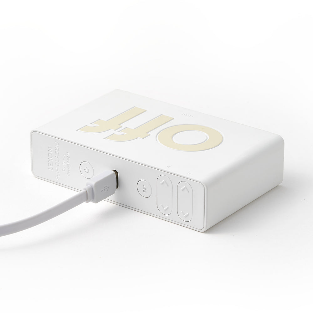 Lexon Flip Classic Reversible Alarm Clock - White - Fun and equipped with two faces (ON / OFF), the alarm clock must be turned down to be activated or deactivated with a simple gesture. Thanks to its integrated touch control, you just have to touch it to trigger the light of its LCD display. In addition, Flip Classic features some discreet buttons on its back to set the time/date format, alarm and screen brightness. Designed to be your ultimate bedside companion, Flip Classic boasts a 6-month battery life, rechargeable via USB-C. A battery indicator is visible on screen so you’ll easily know when to recharge your device.