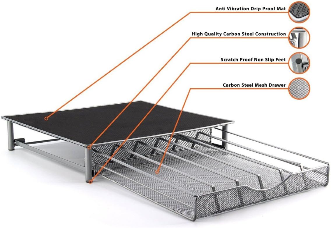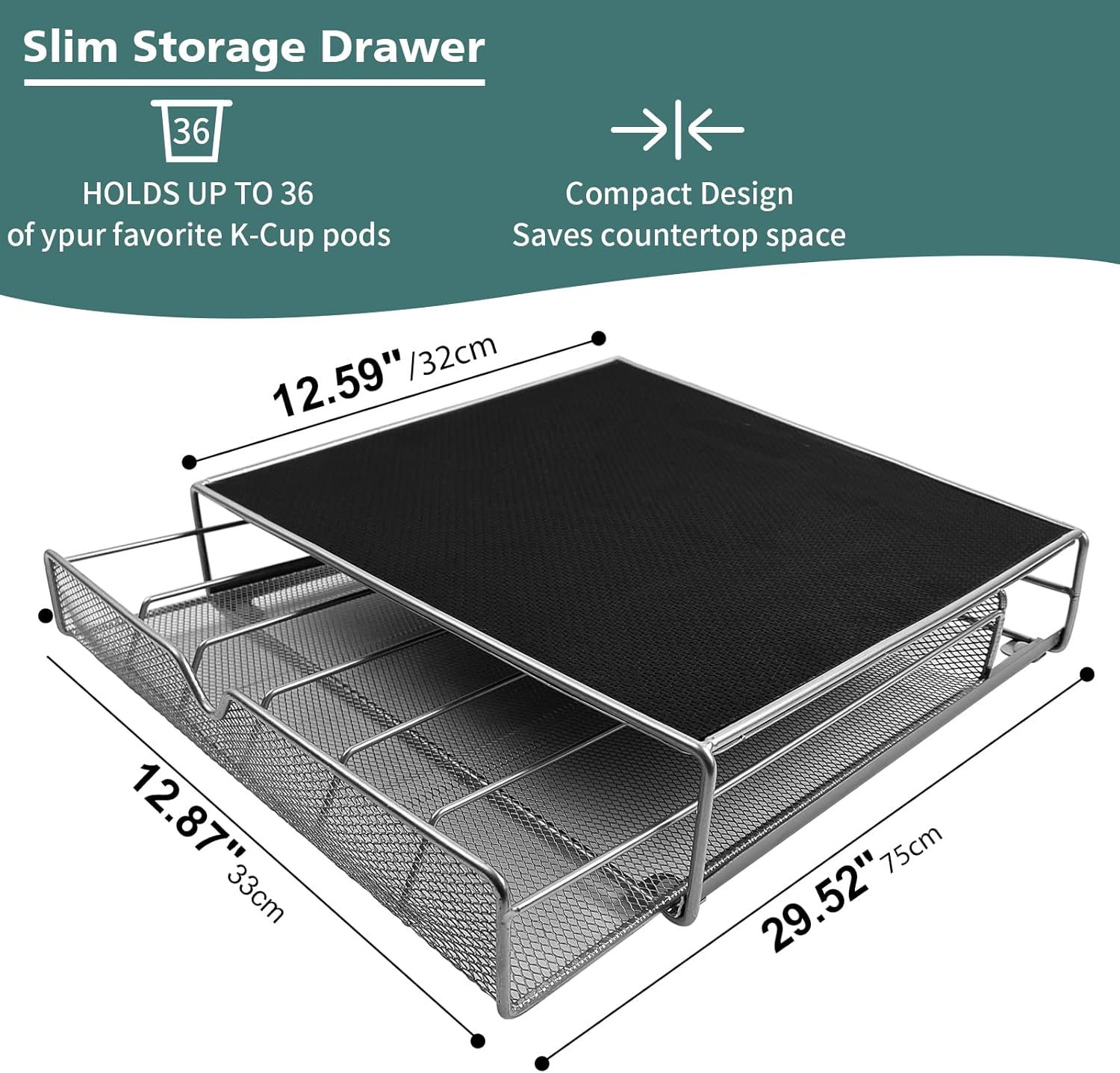 CARLA HOME K-Cup Coffee Pod Drawer for 36 Coffee Pods Storage for Home Kitchen Counter Organizer This item stands out for the following characteristics: LARGE CAPACITY FOR 36 K-PODS: Designed to hold up to 36 K-Pods capsules, this organizer keeps your coffee collection neat, accessible, and ready to brew at any time. Say goodbye to cluttered countertops and messy drawers. ANTI-VIBRATION & DRIP-PROOF SURFACE: Designed with a textured mat that minimizes movement, this sturdy top offers a secure base for your coffee maker or small appliances. It resists drips, absorbs vibration, and helps keep your countertops clean and stable—all while adding a sleek, modern touch to your coffee station. SMOOTH SLIDING DRAWER: Effortlessly access your coffee pods with the smooth-glide drawer that opens fully for easy capsule selection. The rail system ensures quiet operation and maintains stability under weight. SPACE-SAVING KITCHEN ORGANIZER: This pod holder doubles as a countertop riser, freeing up space while offering convenient storage underneath. Perfect for kitchens, offices, or coffee stations with limited room. Key features: Item Dimensions: 32 x 13 x 33 cm. Item weight: 2 kg. Package Dimensions: 41 x 36 x 9 cm. Package weight: 2 kg. The box includes the product and all its components and a simple instruction set. One product per package.