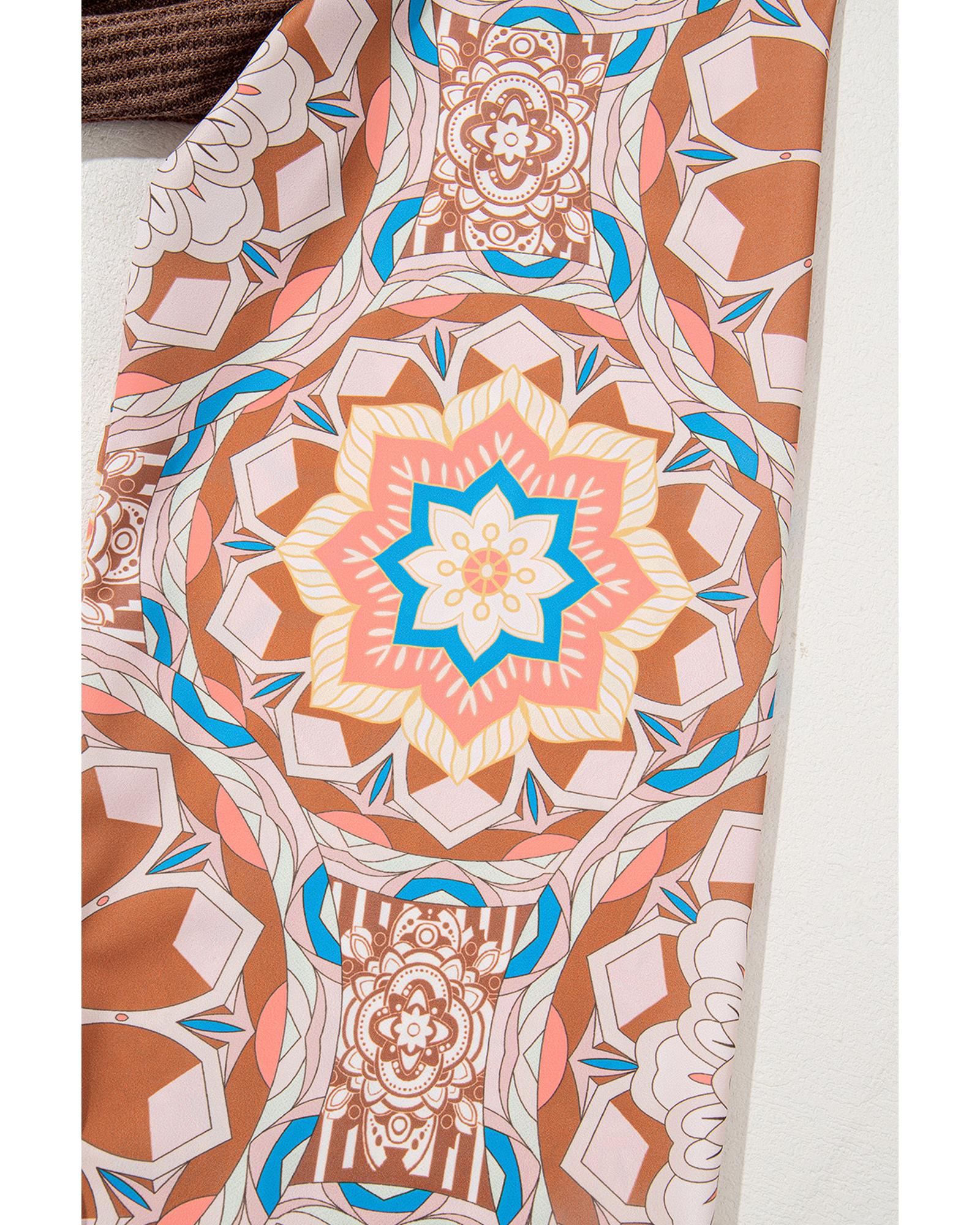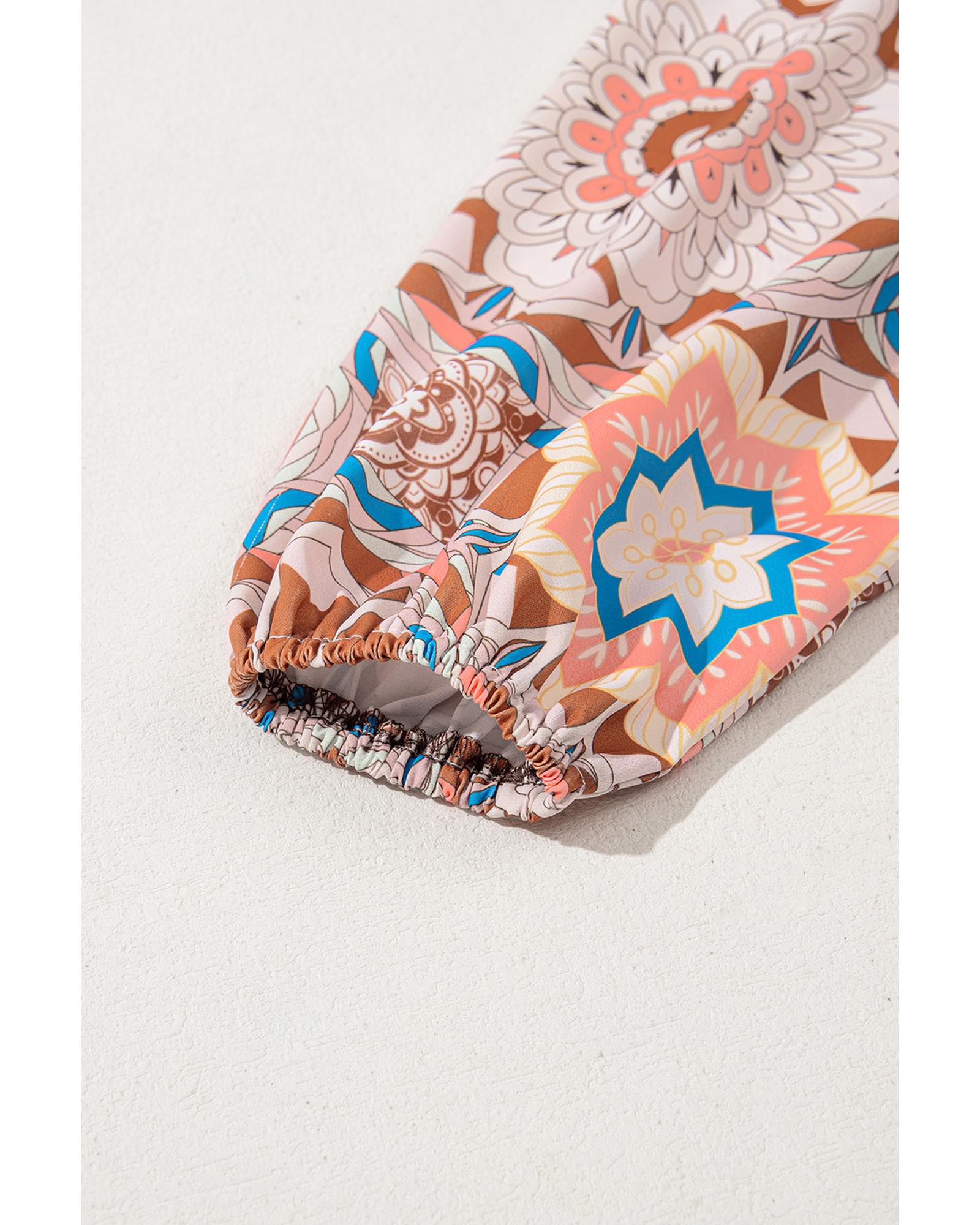 Coffee Ruffled Floral Sleeve Patchwork Waffle Knit O Neck Blouse - M
