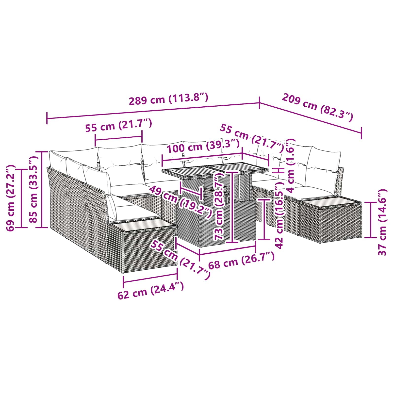 This Poly Rattan Garden Dining Set is all about modern simplicity and functionality, ideal for lifting any outdoor area. With clean lines and a sleek, minimalist design, this set provides a comfy dining or relaxation spot for your garden or terrace. Blending poly rattan and solid acacia wood, the set strikes a great balance between strength and elegance, promising a delightful outdoor experience. Robust Materials: Made from poly rattan, powder-coated steel, and acacia wood, this garden dining set is designed for durability and longevity. The UV-resistant poly rattan ensures it stands up to harsh sunlight, while the powder-coated steel provides a sturdy, -resistant frame. Comfortable for social gatherings, it serves both style and practical needs. Versatile Components: The set includes two side sofas, two corner seats, a centre seat, and a garden table, giving you plenty of seating and dining options. Each piece has storage for cushions and essentials. The modular design lets you change it up to fit your layout or adapt to guests, making customization a breeze for every occasion. Adjustable Features: With adjustable feet, this dining set handles uneven surfaces, boosting stability in your outdoor area. The modular setup also allows for flexible arrangements, while the square armrests bring defined lines to the modern aesthetic. This thoughtful mix ensures comfort whether you're entertaining or just chilling out. Outdoor-Specific: Designed for seasonal use, the set thrives in summer and spring, perfectly suiting gardens and terraces. Its UV resistance keeps its vibrant appearance, and it's great for outdoor parties and meals. Care Instructions: To keep it looking sharp, use a cover when it's not in use to protect against the elements. Although assembly isn't needed, cleaning is a cinch with dry methods, avoiding harsh chemicals that could wear out the elegant materials over time.