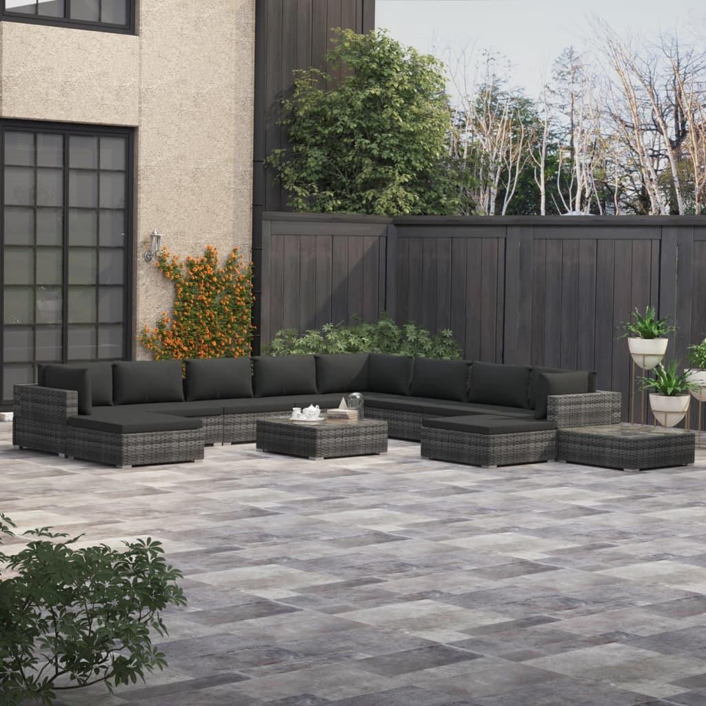 This rattan sofa set combines style and functionality, and will become the focal point of your garden or patio. The whole furniture set is designed to be used outdoors year-round. Thanks to the weather-resistant and waterproof PE rattan, the lounge set is easy to clean, hard-wearing and suitable for daily use. The seat set features a sturdy powder-coated steel frame, which is highly durable. It is also lightweight and modular, which makes it completely flexible and easy to move around to suit any setting. The thick, removable cushions are highly comfortable. Delivery includes 3 corner sofas, 5 middle sofas, 2 footrests, 2 coffee tables, 10 seat cushions and 11 back cushions. Note: We recommend covering the set in the rain, snow and frost.