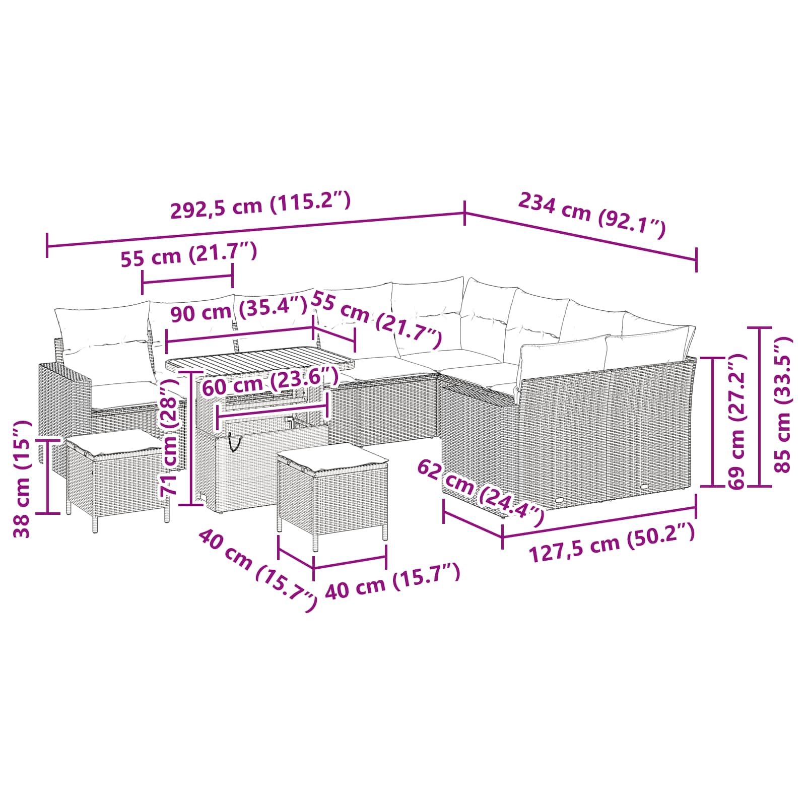 • 2 x Arm sofa, 2 x Corner seat, 5 x Centre seat, 2 x Stool, 1 x Table