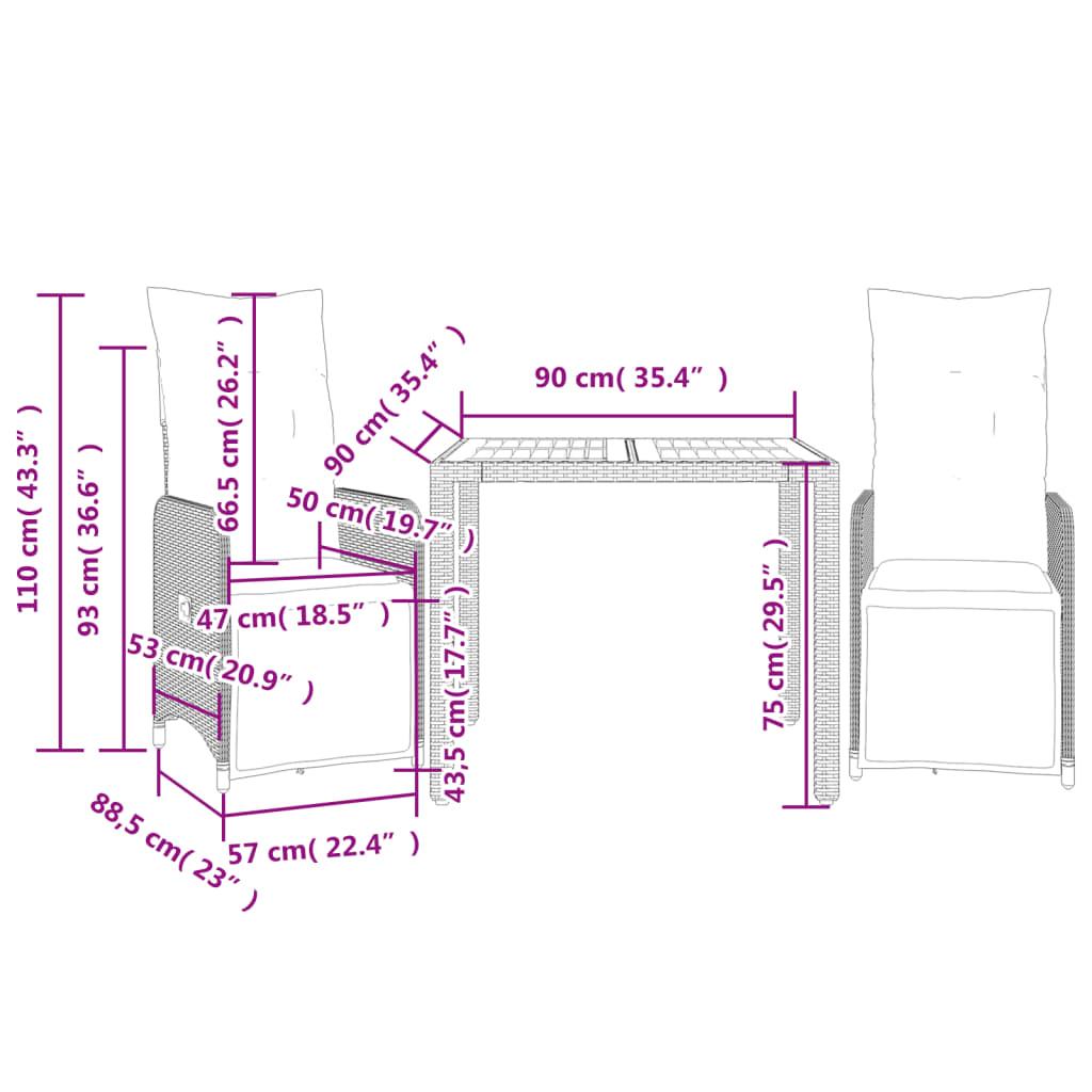 Enjoy a coffee or have a chat with your family and friends in the garden, backyard, or on the balcony with this comfortable bistro set! Durable material: PE rattan, also known as poly rattan, is a strong, low-maintenance synthetic material that looks like natural rattan. It's lightweight, easy to clean, and commonly used for outdoor furniture due to its durability and weather-resistant properties.Adjustable backrest and footrest: This garden seat has a handle. You can adjust the backrest and footrest to any position by pulling the handle, and quickly return it to its original position.Comfortable seat experience: This outdoor furniture, complete with thickly padded cushions, offers a comfortable seating experience.Removable and washable cover: These seat cushions feature removable covers for easy washing and maintenance. The back cushions have a flap at the back for easy attachment to the backrests.Stable and easy-to-clean tabletop: This garden table has an acacia wood top that is sturdy, durable, and easy to clean with a damp cloth. Good to know:To make sure your outdoor furniture stays beautiful, we recommend protecting it with a waterproof cover.