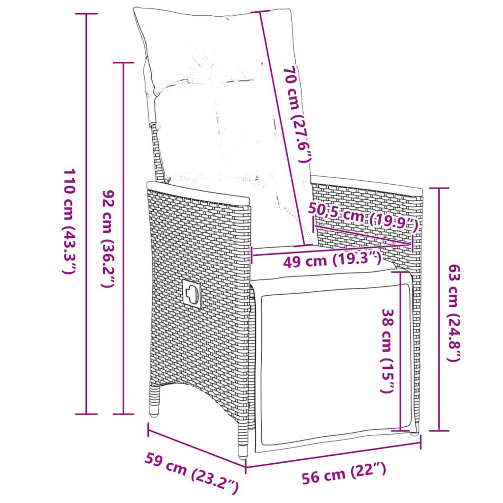 Enjoy a coffee or have a chat with your family and friends in the garden, backyard, or on the balcony with this comfortable bistro set! Durable material: PE rattan, also known as poly rattan, is a strong, low-maintenance synthetic material that looks like natural rattan. It's lightweight, easy to clean, and commonly used for outdoor furniture due to its durability and weather-resistant properties.Adjustable backrest and footrest: This garden seat has a handle. You can adjust the backrest and footrest to any position by pulling the handle, and quickly return it to its original position.Comfortable seat experience: This outdoor furniture, complete with thickly padded cushions, offers a comfortable seating experience.Removable and washable cover: These seat cushions feature removable covers for easy washing and maintenance. The back cushions have a flap at the back for easy attachment to the backrests.Stable and easy-to-clean tabletop: This garden table has an acacia wood top that is sturdy, durable, and easy to clean with a damp cloth. Good to know:To make sure your outdoor furniture stays beautiful, we recommend protecting it with a waterproof cover.
