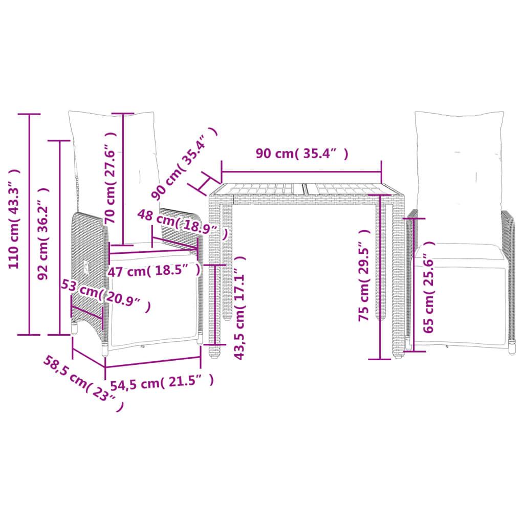 Enjoy a coffee or have a chat with your family and friends in the garden, backyard, or on the balcony with this comfortable bistro set! Durable material: PE rattan, also known as poly rattan, is a strong, low-maintenance synthetic material that looks like natural rattan. It's lightweight, easy to clean, and commonly used for outdoor furniture due to its durability and weather-resistant properties.Adjustable backrest and footrest: This garden seat has a handle. You can adjust the backrest and footrest to any position by pulling the handle, and quickly return it to its original position.Comfortable seat experience: This outdoor furniture, complete with thickly padded cushions, offers a comfortable seating experience.Removable and washable cover: These seat cushions feature removable covers for easy washing and maintenance. The back cushions have a flap at the back for easy attachment to the backrests.Stable and easy-to-clean tabletop: This garden table has an acacia wood top that is sturdy, durable, and easy to clean with a damp cloth. Good to know:To make sure your outdoor furniture stays beautiful, we recommend protecting it with a waterproof cover.