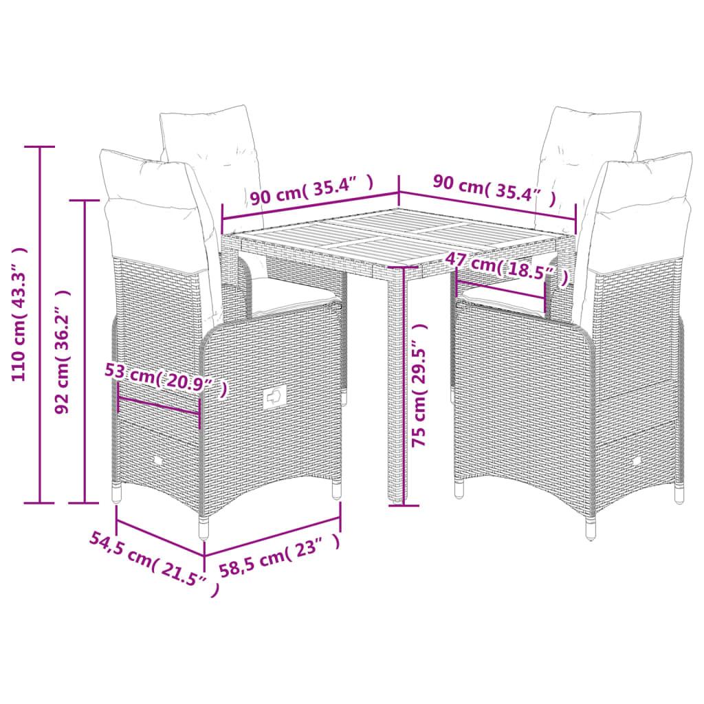 Enjoy a coffee or have a chat with your family and friends in the garden, backyard, or on the balcony with this comfortable bistro set! Durable material: PE rattan, also known as poly rattan, is a strong, low-maintenance synthetic material that looks like natural rattan. It's lightweight, easy to clean, and commonly used for outdoor furniture due to its durability and weather-resistant properties.Adjustable backrest: This garden seat has a handle. You can adjust the backrest to any position by pulling the handle, and quickly return it to its original position.Comfortable seat experience: This outdoor furniture, complete with thickly padded cushions, offers a comfortable seating experience.Removable and washable cover: These seat cushions feature removable covers for easy washing and maintenance. The back cushions have a flap at the back for easy attachment to the backrests.Stable and easy-to-clean tabletop: This garden table has an acacia wood top that is sturdy, durable, and easy to clean with a damp cloth. Good to know:To make sure your outdoor furniture stays beautiful, we recommend protecting it with a waterproof cover.