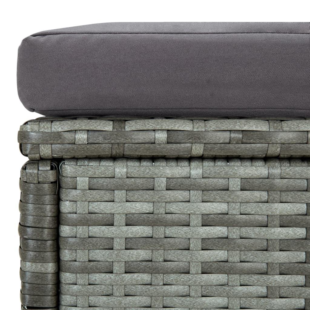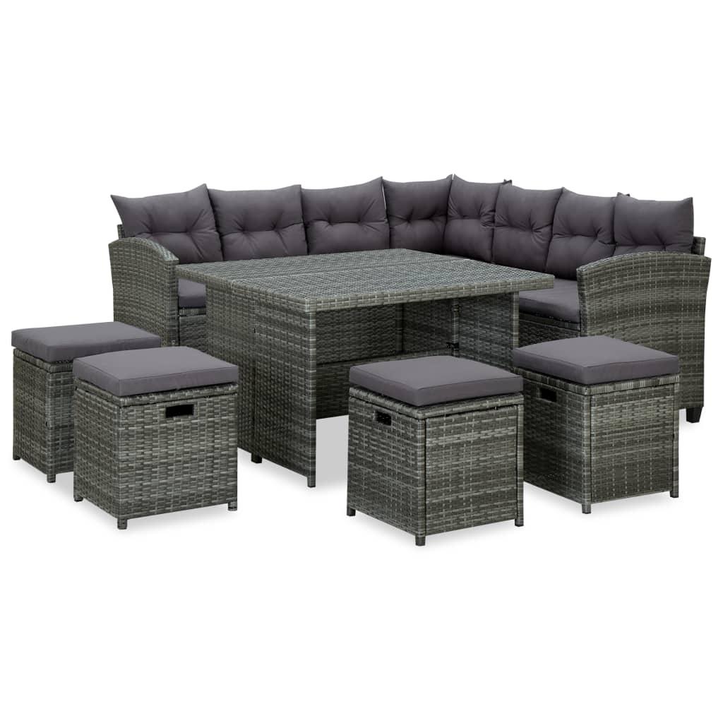 Enjoy chatting with your family members and friends in your outdoor space on this poly rattan garden lounge set with cushions! This comfy patio lounge set, featuring a powder-coated steel frame covered with PE rattan, is sturdy and easy to clean, making it ideal for daily outdoor use. Thanks to its lightweight construction, you can move the set easily. The thickly padded cushions add extra comfort in your lounging time. The corner sofa and stools provide enough seating space for family gatherings. In addition, the coffee table is ideal for placing drinks, food and decorative items. Note: In order to extend the life of your outdoor furniture, we recommend you to clean it regularly and do not leave it outdoors without protection unnecessarily.Clean: Use a mild soap solution.Storing: If possible, store in a cool, dry place indoors. If the product is stored outdoors, protect it with a waterproof cover. Wipe and dry the excess water or snow from flat surfaces after a rain or snowfall. Allow sufficient air circulation to avoid moisture-related damage.