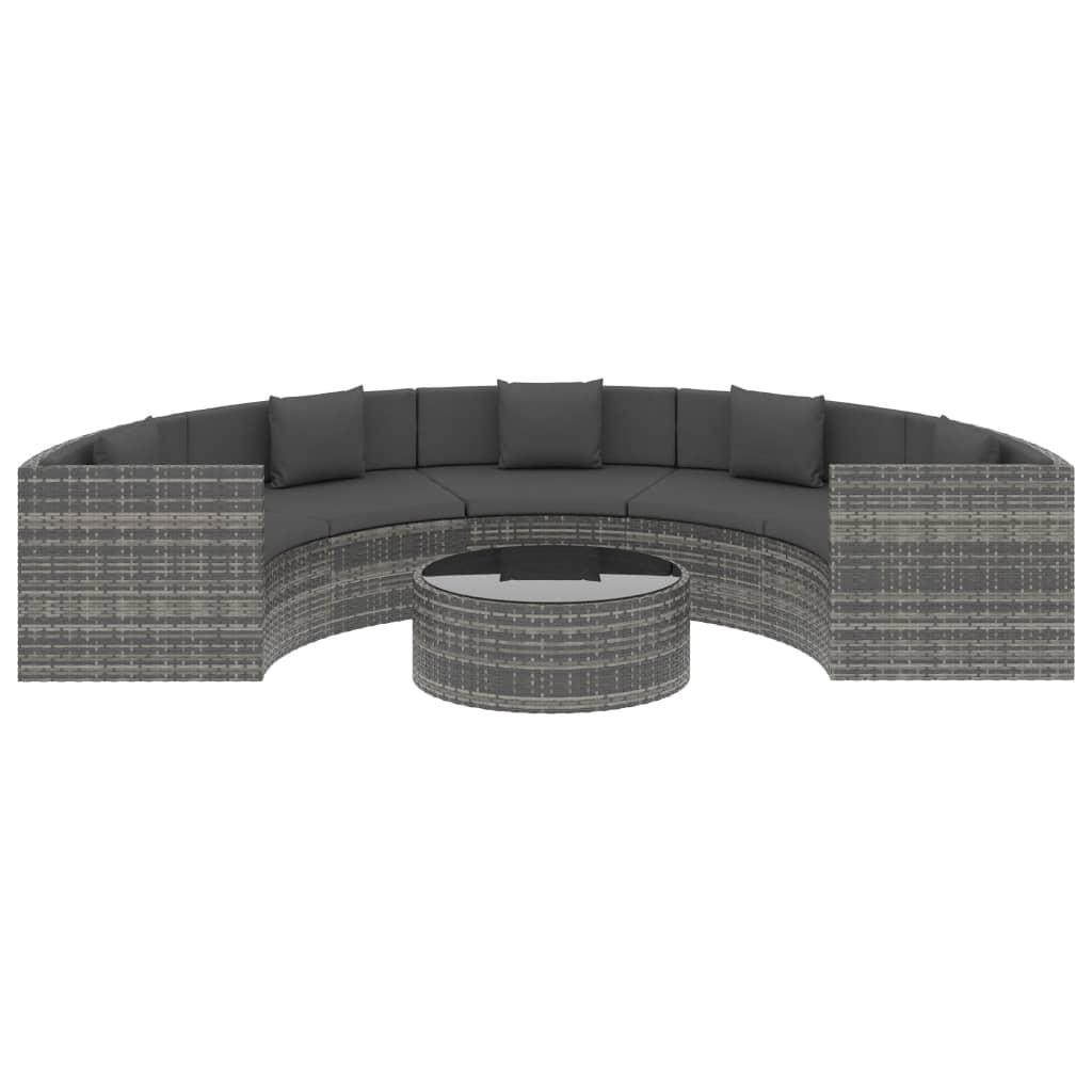 This stylish half-round garden lounge set will be an eye-catcher in your garden, backyard or balcony. Made of PE rattan, the garden sofa set is designed to be used outdoors year round. The powder-coated steel frame brings super stability and ensures the lounge set a long service life and excellent durability. The weather resistant and waterproof PE rattan makes the sofa set easy to clean. The thick soft cushions and pillows, made of water-repellent polyester, will undoubtedly bring ultimate seating comfort. In addition, the covers are equipped with zippers, removable and washable. The outdoor furniture set features elegant design, excellent aesthetics and high durability. Note: We recommend covering the set during rain, snow and frost.