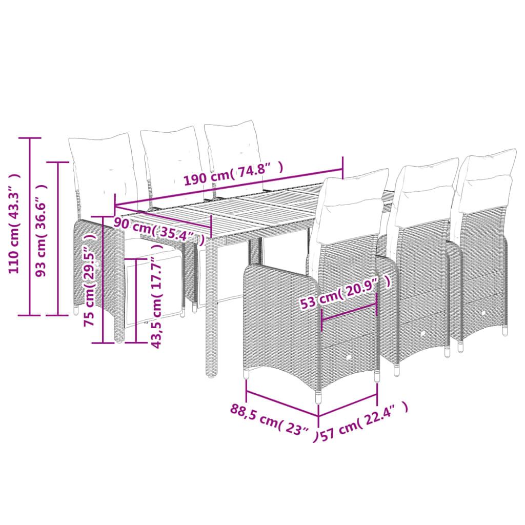 Enjoy a coffee or have a chat with your family and friends in the garden, backyard, or on the balcony with this comfortable bistro set! Durable material: PE rattan, also known as poly rattan, is a strong, low-maintenance synthetic material that looks like natural rattan. It's lightweight, easy to clean, and commonly used for outdoor furniture due to its durability and weather-resistant properties.Adjustable backrest and footrest: This garden seat has a handle. You can adjust the backrest and footrest to any position by pulling the handle, and quickly return it to its original position.Comfortable seat experience: This outdoor furniture, complete with thickly padded cushions, offers a comfortable seating experience.Removable and washable cover: These seat cushions feature removable covers for easy washing and maintenance. The back cushions have a flap at the back for easy attachment to the backrests.Stable and easy-to-clean tabletop: This garden table has an acacia wood top that is sturdy, durable, and easy to clean with a damp cloth. Good to know:To make sure your outdoor furniture stays beautiful, we recommend protecting it with a waterproof cover.