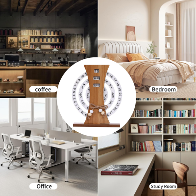 Bring timeless elegance to your space with this beautifully crafted wooden perpetual calendara perfect blend of artistry and functionality. Designed for both practical use and visual appeal, this rotating desk calendar features a sleek, hourglass-shaped body made from high-quality natural wood, offering warmth and durability that enhances any environment. The three interlocking circular discs allow you to easily adjust the date, month, and day, creating a tactile experience that connects you to the rhythm of timeno batteries or digital screens needed. Each turn of the disc brings a sense of mindfulness, making it more than just a calendar: its a daily ritual of presence. Adorned with a delicate rope and wooden bead accent, it adds a subtle rustic charm that complements modern, minimalist, or bohemian interiors alike. Whether placed on your office desk, bedside table, study shelf, or coffee bar, it becomes a focal point of calm and style. Its compact yet striking design fits seamlessly into small spaces without overwhelming them. Unlike disposable calendars, this one lasts foreverreusable year after year, reducing waste while adding lasting value. It's not only a functional tool but also a thoughtful gift for housewarmings, weddings, birthdays, anniversaries, or holidays, symbolizing care, continuity, and appreciation for lifes simple moments.