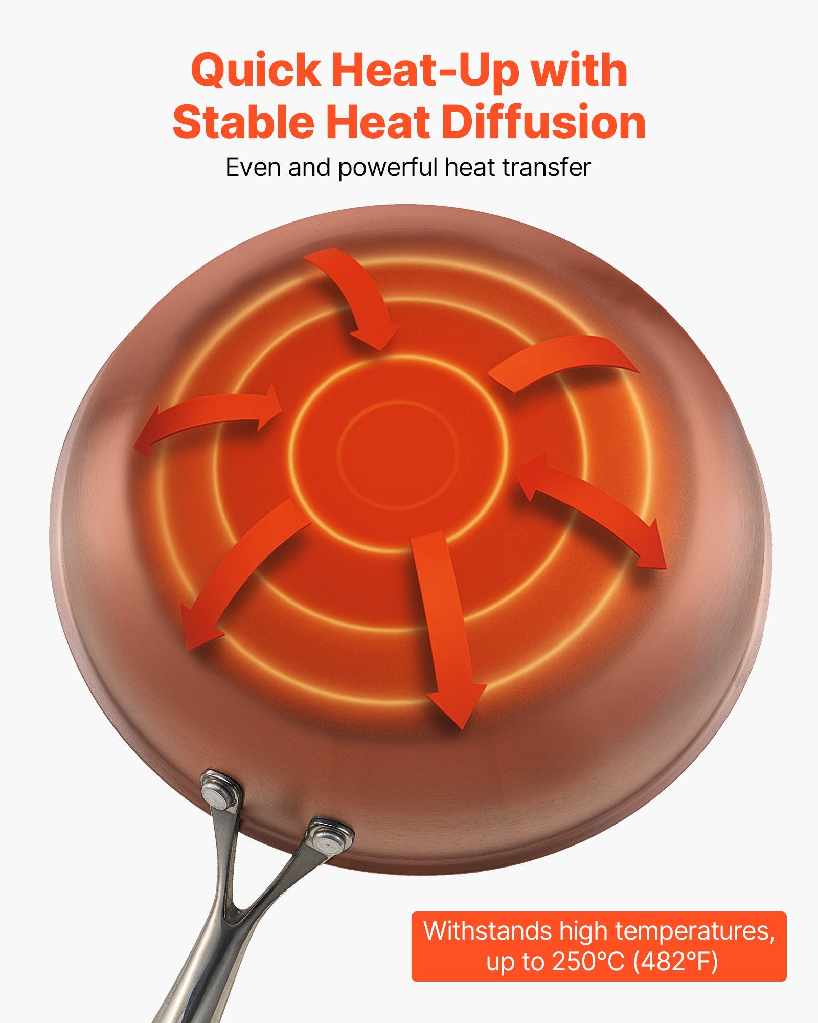 Our frying pan set features a triply-layer stainless steel with polished surface interior and exterior, providing even heat distribution and durability. Its composite stainless steel surface resists scratches and warping for daily use