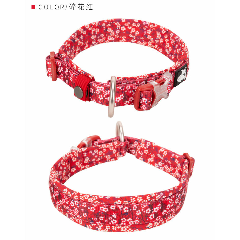 Floral doggie collar. This stylish Dog collar is padded and super comfortable. It can be accessorised with the matching lead and harness. Easy to secure with a durable snap buckle. Easy to put and take off with. Features an O ring for secure leash attachment.