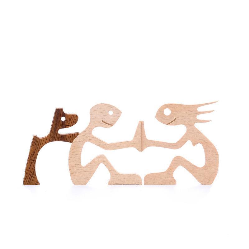 Handmade Wooden Statue Sitting Family and Dog Craft Home Decor - B05