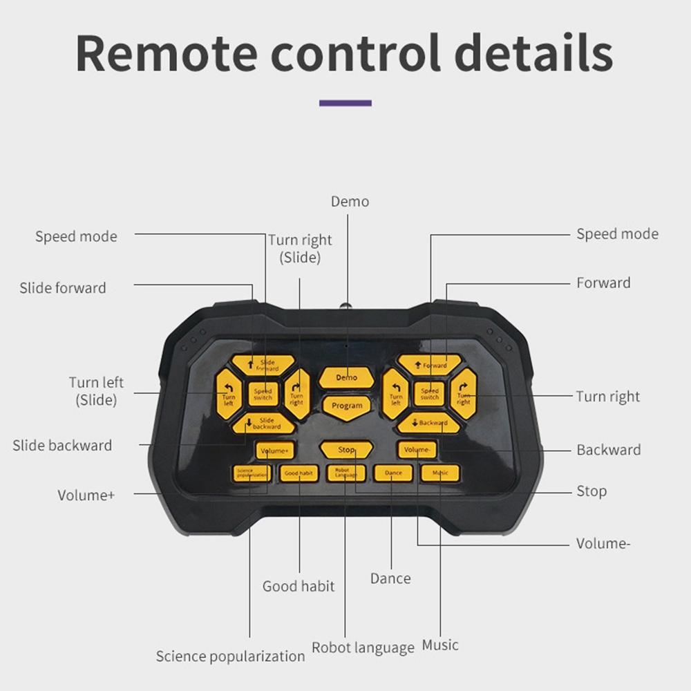 • Remote control: Use the included remote to make the robot walk in any direction.