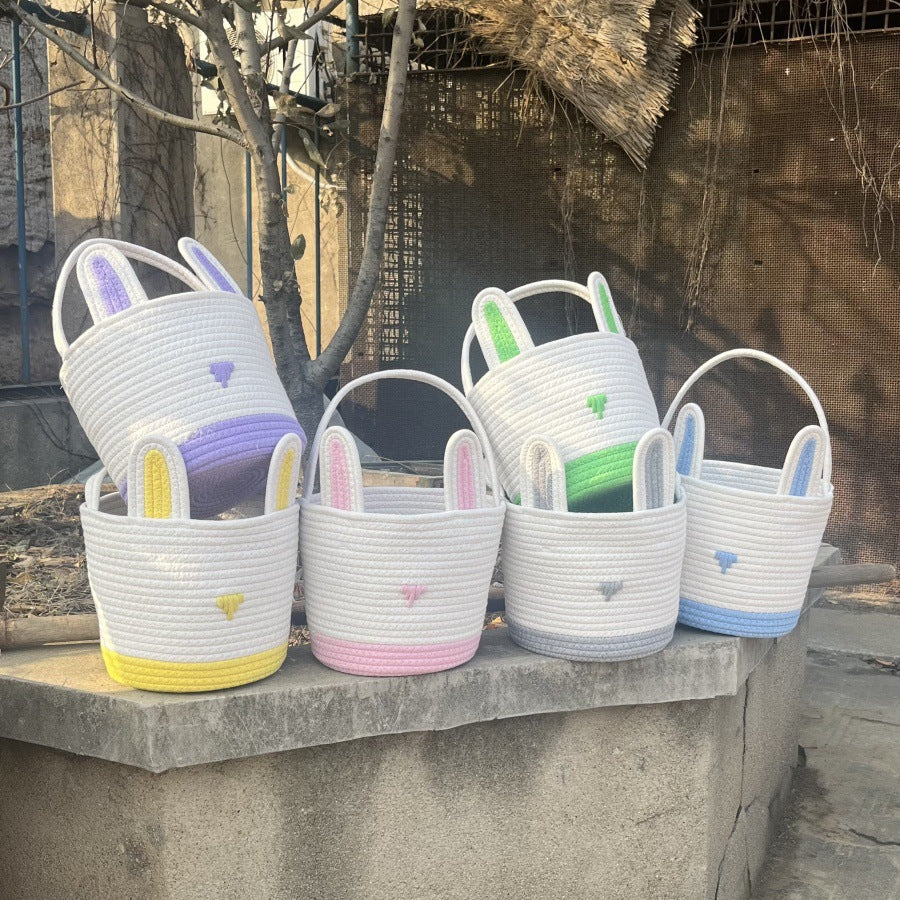 Blue And White Stitching Charming Easter Egg Tote Basket - Cute Rabbit-Themed Handwoven Cotton Rope Candy Holder