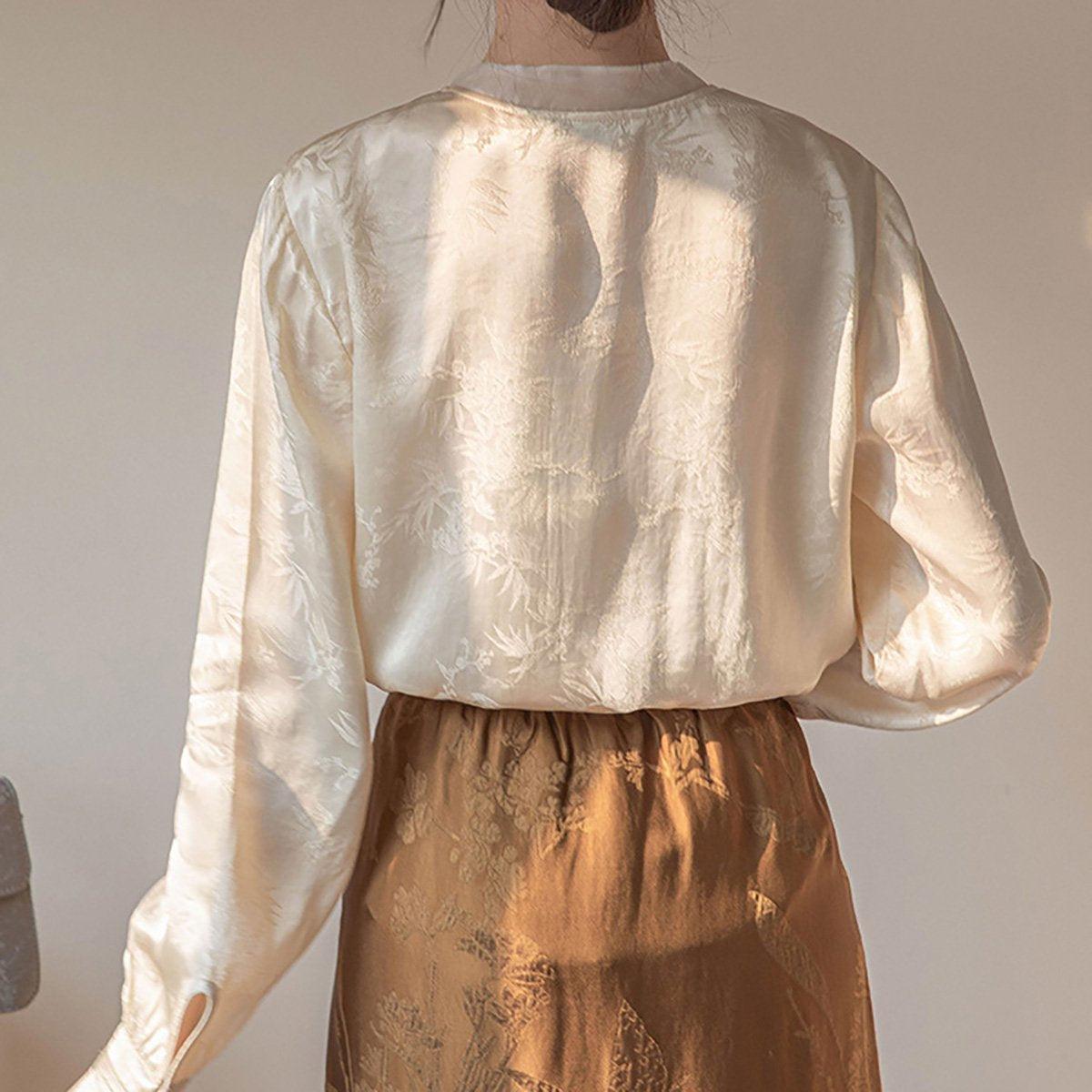 Elevate your wardrobe with this elegant long-sleeved shirt, featuring a refined stand-up collar that embodies the essence of Chinese style. Crafted from a premium fabric that exudes a soft sheen, this top is designed to offer both comfort and sophistication. The unique design details, such as the asymmetrical button placement and tailored cuffs, add a touch of modern flair while maintaining a timeless appeal. Perfect for both formal and casual occasions, this shirt pairs beautifully with skirts or trousers, making it a versatile addition to your collection.