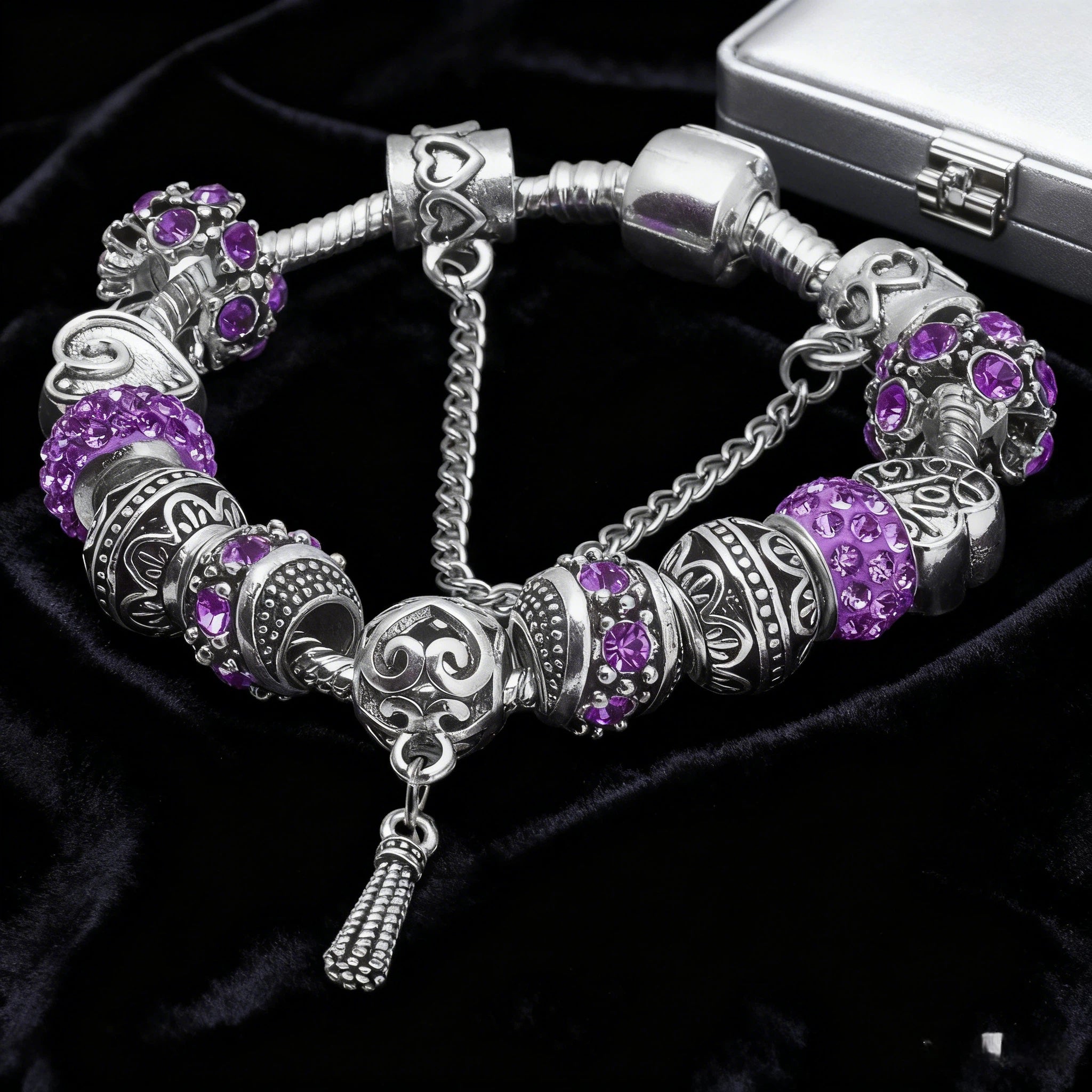 Womens Vintage Silver-Plated Charm Bracelet - Crystal-Embedded Hollow Carved Multi-Bead Fashion Jewelry (5 Colors, 4 Adjustable Sizes 17-20cm) |