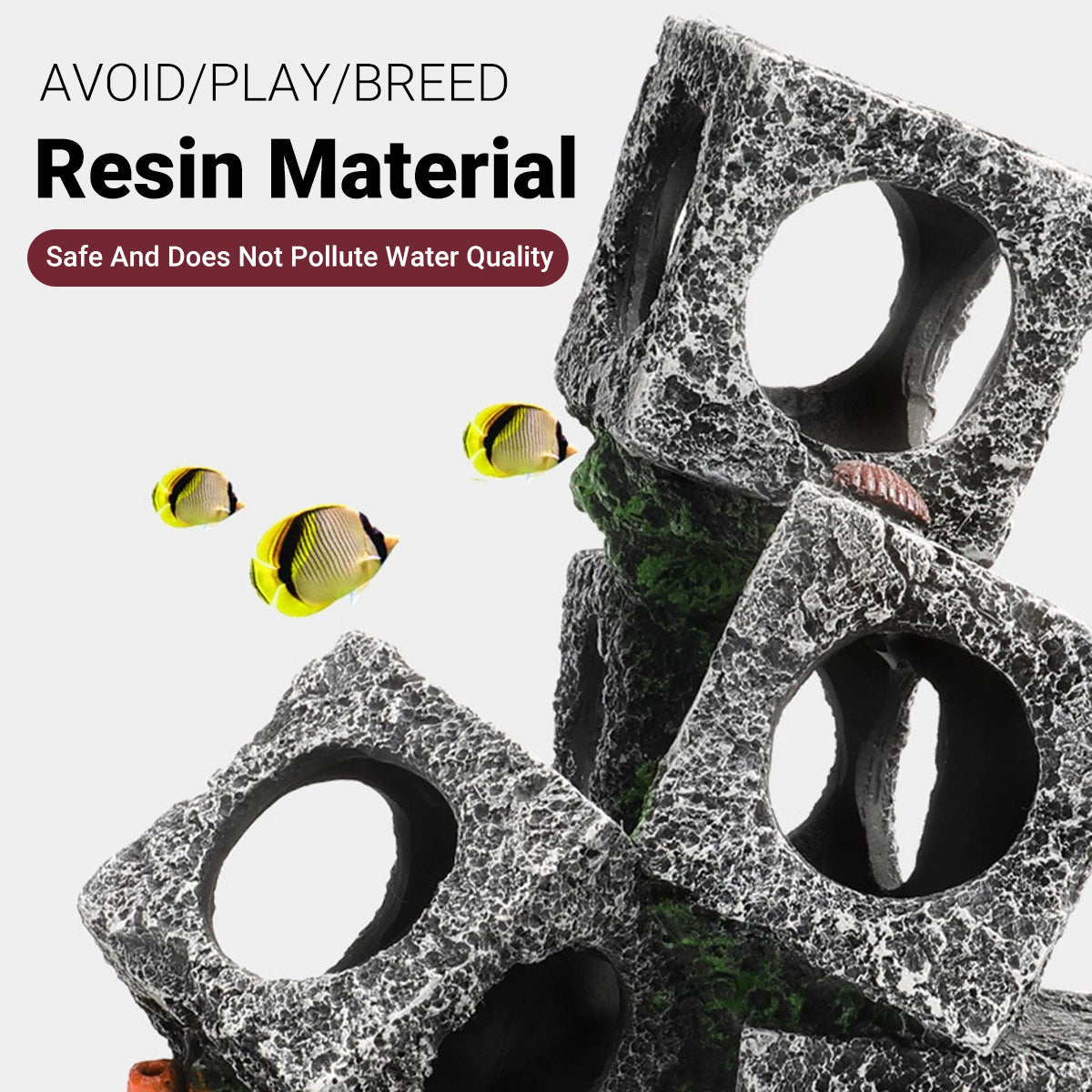 Create a more enriching aquatic environment with this square stone-style resin shelter, available in 2, 3, or 5-cube configurations. Designed to resemble natural rock, it offers hiding and breeding spaces for small fish, shrimp, and cichlids. The open circular design encourages movement, reduces stress, and supports a balanced ecosystem. Perfect for aquascaping, this shelter blends function and visual appeal for any freshwater or saltwater aquarium.