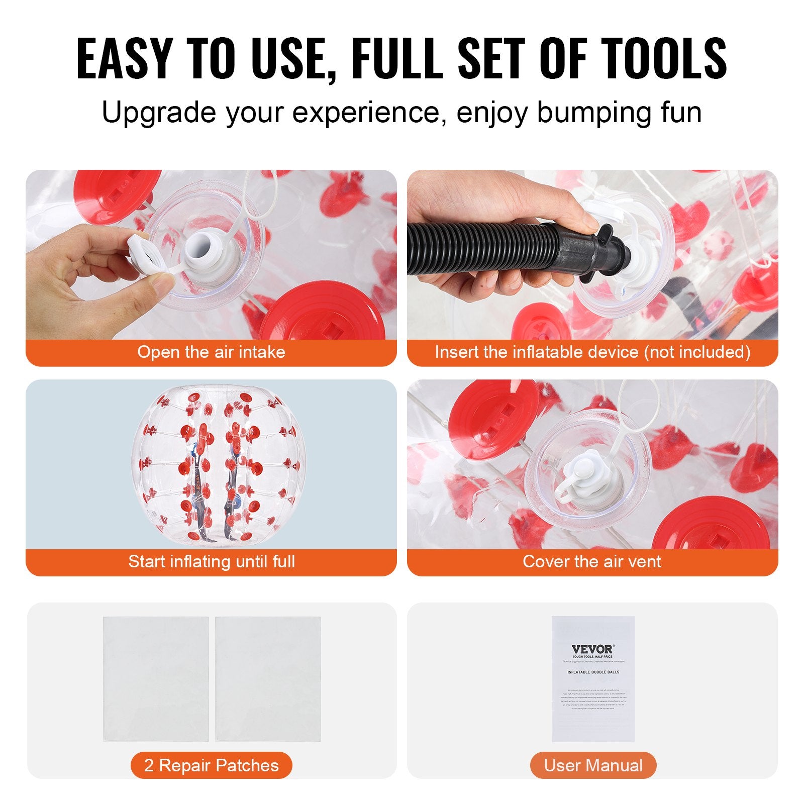 VEVOR human hamster bubble balls are suitable for solo or group entertainment, enjoy the freedom of bouncing, bopping, and bumping with friends. It is ideal for gardens, backyards, playgrounds, parks, recreation centers, enjoying bumping fun anytime, anywhere.
