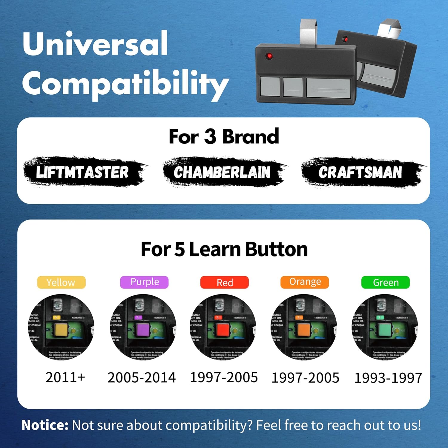 Universal: Works on LiftMaster, Chamberlain and Craftsman garage door openers manufactured from 1993 to current; Compatible for 3 different frequencies of security rolling code, it’s the easy option for adding an extra remote to multi-car families or for replacing lost or broken remotes