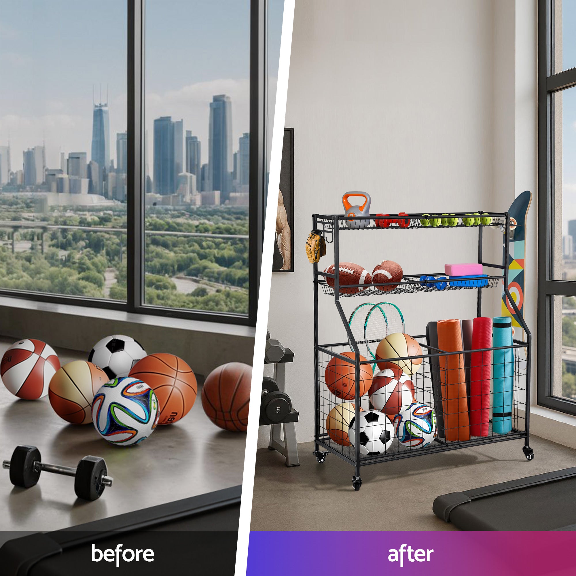 Everfit Sports Equipment Organizer Storage with Wheels Multi-Sport Garage Gym Black