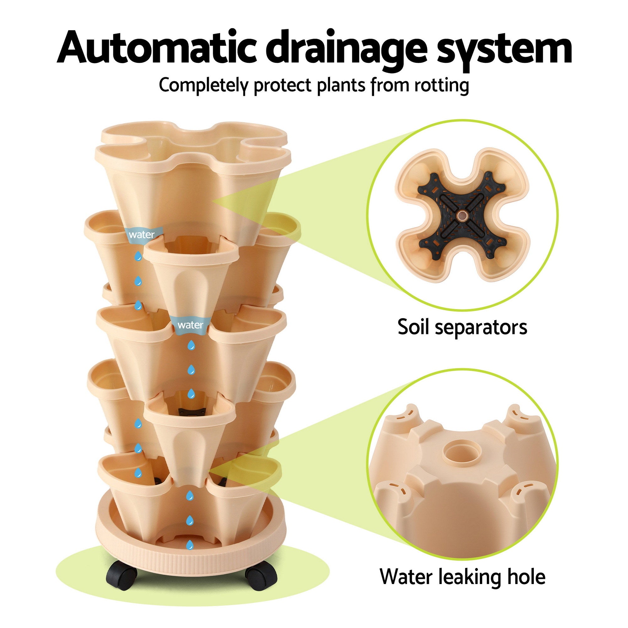 Advanced Root Health and Protection Our integrated Automatic Drainage System takes the guesswork out of watering. Each tier is equipped with specialized soil separators and drainage holes that allow water to cascade through the layers, preventing waterlogging and ensuring your herbs and strawberries grow in a perfectly balanced environment.