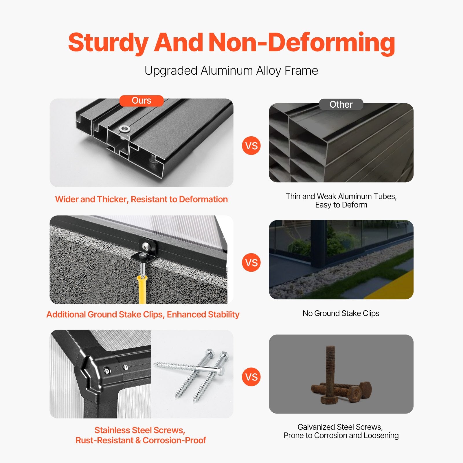 The polycarbonate greenhouse is equipped with a thicker and stronger black aluminum frame, which is lightweight yet highly durable, with stainless steel screws for a longer service life and better resistance to harsh weather conditions.