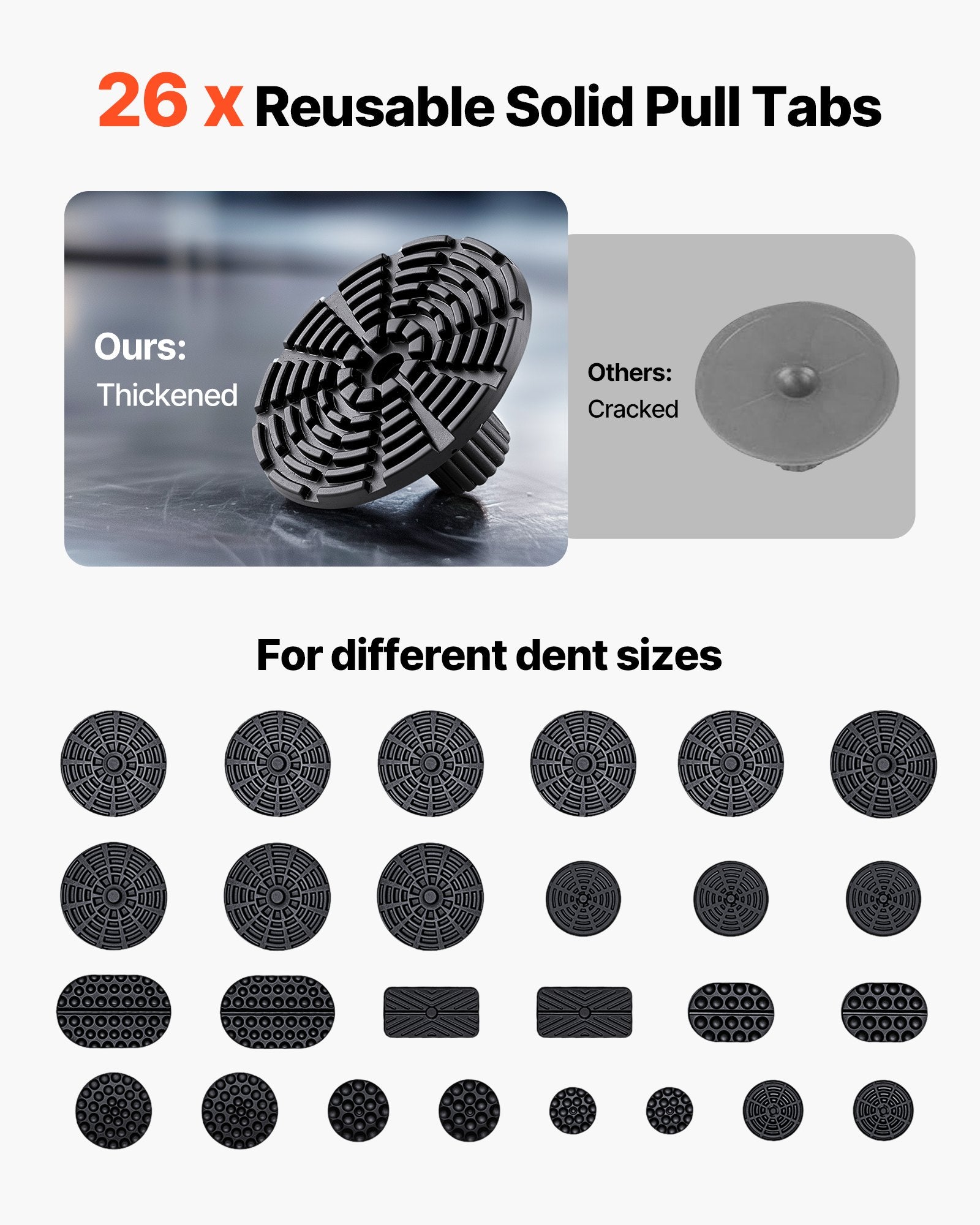 This paintless dent removal kit comes with multiple sizes of pull tabs, handling tiny hail dents and medium-sized collision dents. The solid rubber tabs are tough and reusable, and grip tightly without damaging your paint