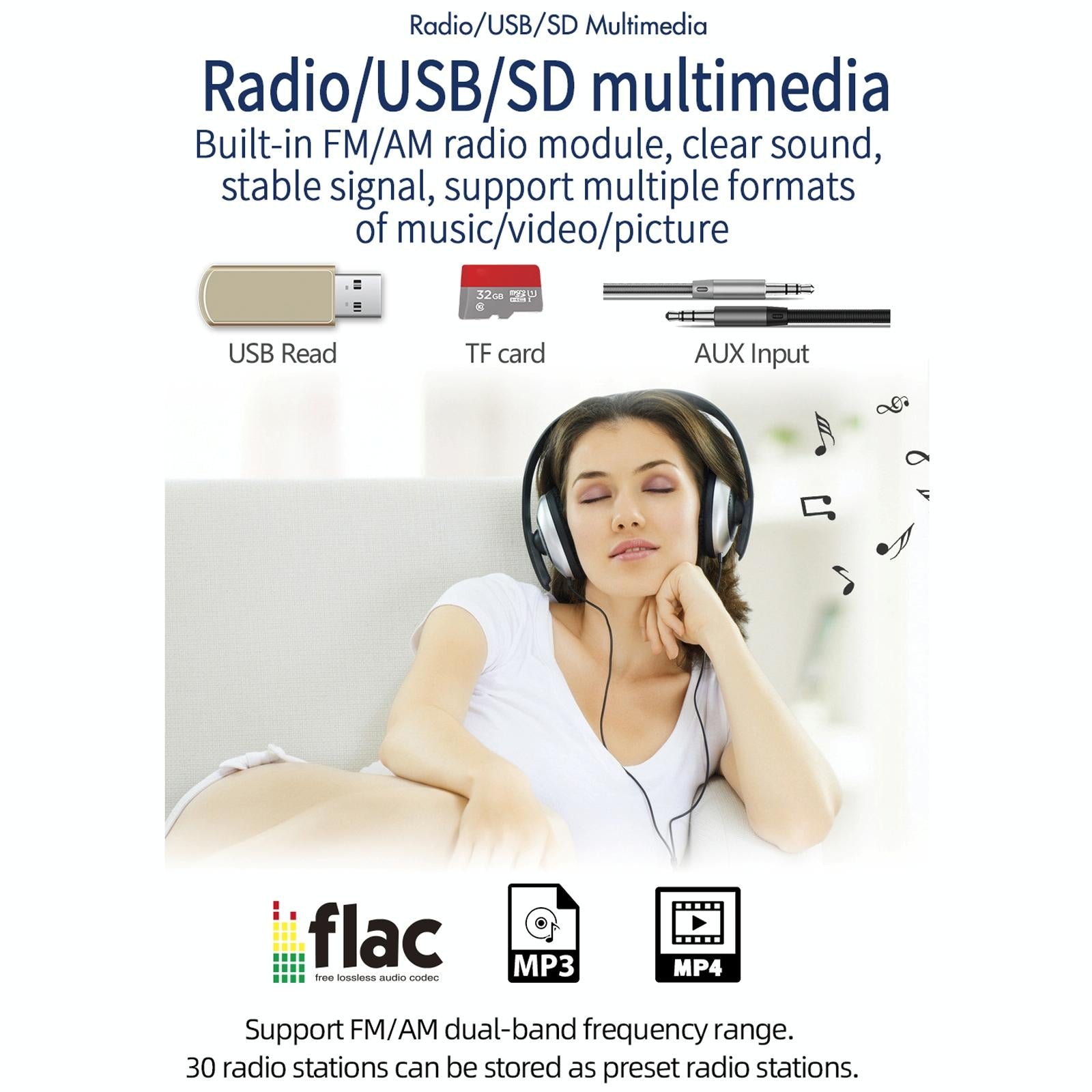• Supports MP3, WMA, WAV, APE, FLAC audio formats