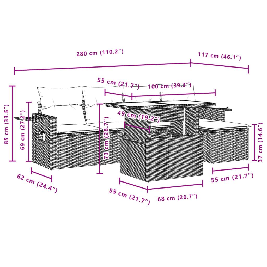 This garden sofa set is the perfect addition to your backyard, terrace, or patio, providing a comfortable and inviting space for chatting with family and friends or simply relaxing and enjoying the outdoors. Durable material: PE rattan, also known as poly rattan, is a strong, low-maintenance synthetic material that looks like natural rattan. It's lightweight, easy to clean, and commonly used for outdoor furniture due to its durability and weather-resistant properties.Adjustable tabletop: The tabletop can be lifted to make the table higher, which transforms the outdoor table from a coffee table to a dining table. It's perfect for having guests over or eating meals outside.Convenient side table: This outdoor furniture features foldable side tables with a gas spring on the armrests, providing convenient spots to keep your essentials within easy reach. Comfortable seat experience: This outdoor furniture, complete with thickly padded cushions, offers a comfortable seating experience.Modular design: This outdoor furniture set has a modular design, making it completely flexible and easy to move around, so you can create a customised outdoor furniture arrangement. Good to know:To make sure your outdoor furniture stays beautiful, we recommend protecting it with a waterproof cover.