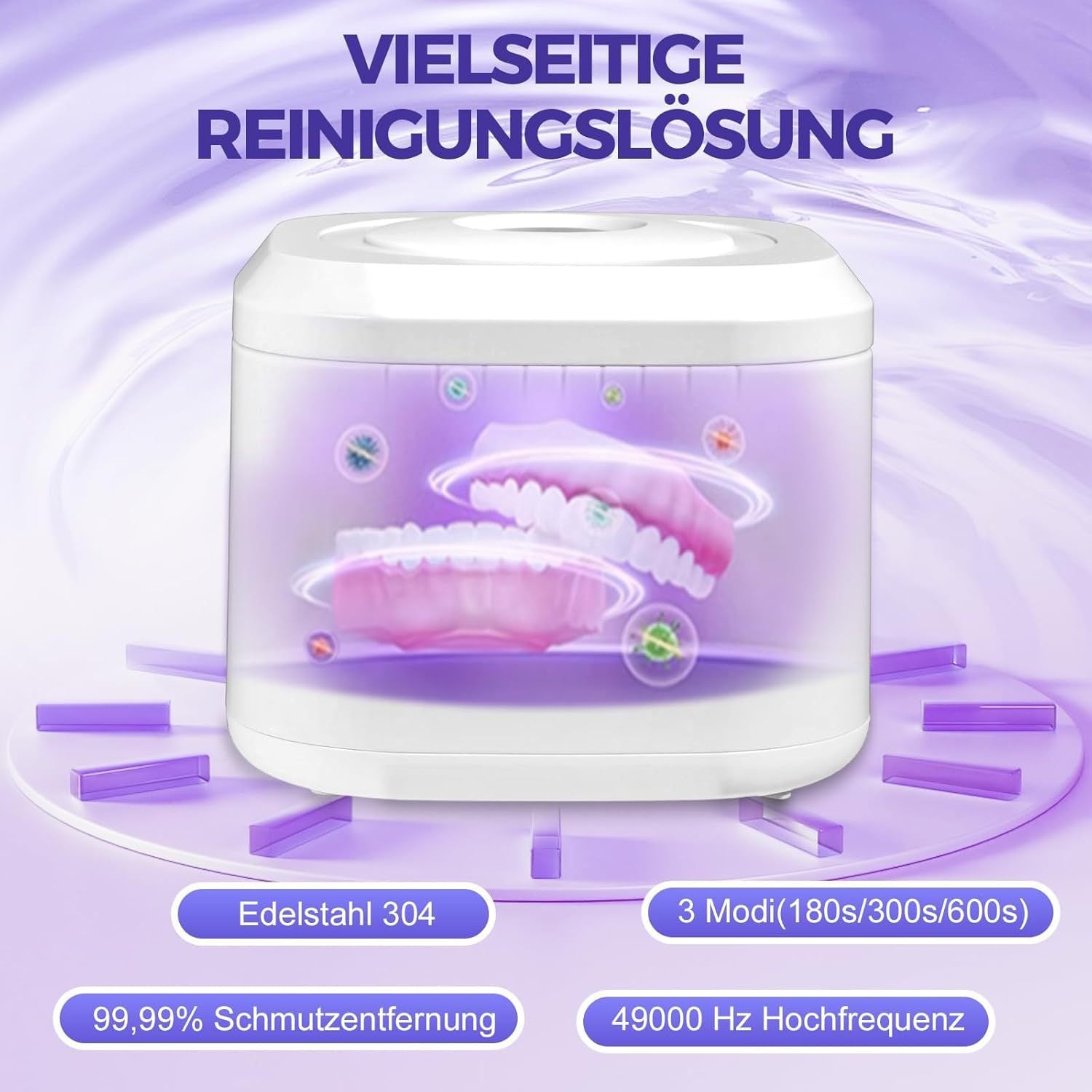 • Multi-Purpose: An essential device for maintaining oral hygiene (dentures, retainers, mouthguards, aligners) and restoring the sparkle to jewelry and eyeglasses.