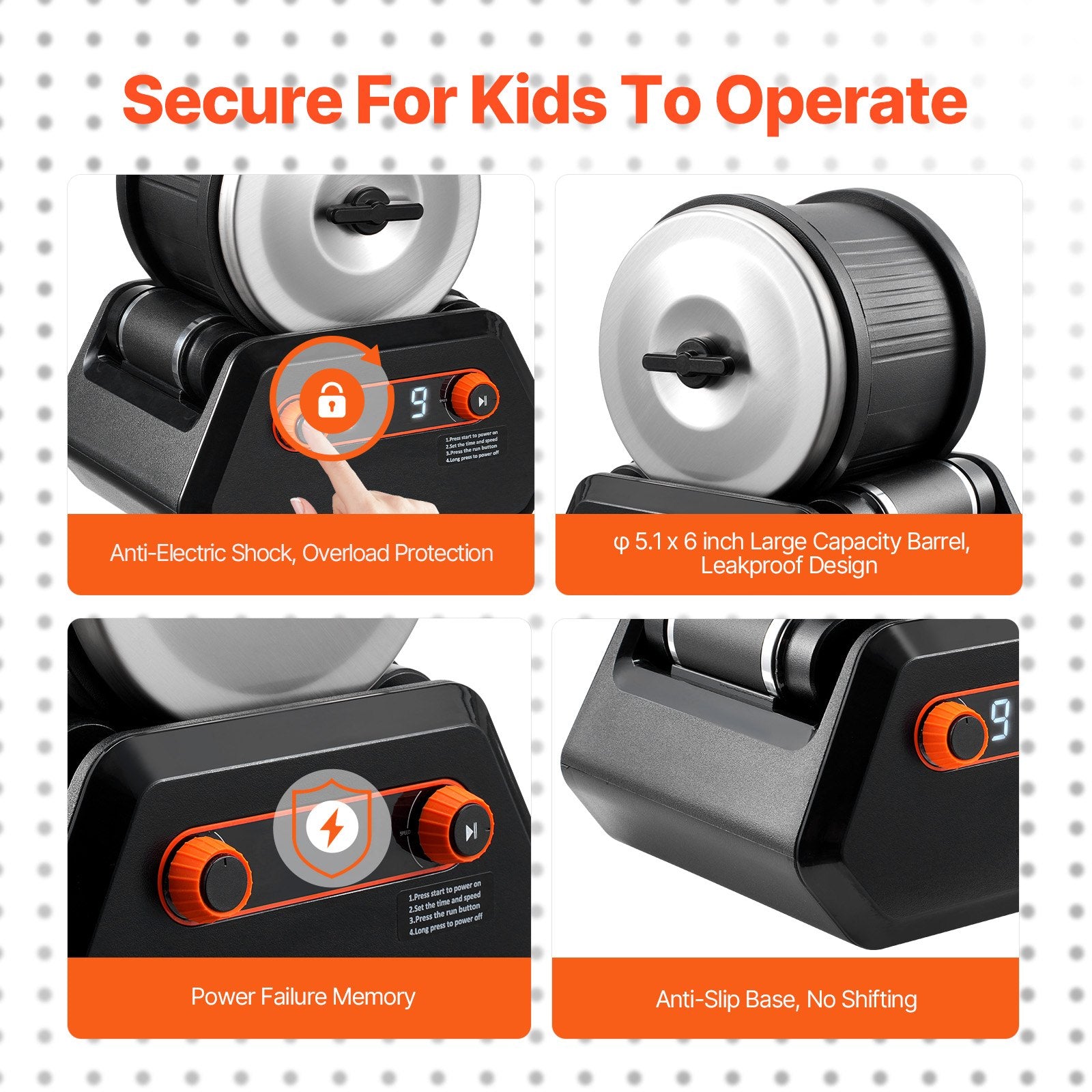 The stone tumbler features an upgraded curved lid design for easy and hand-secure twisting. The high-seal chamber prevents water leakage and keeps your workspace clean. It also features a grooved handle for easy lifting and anti-slip pads to keep the machine stable during powerful operation.