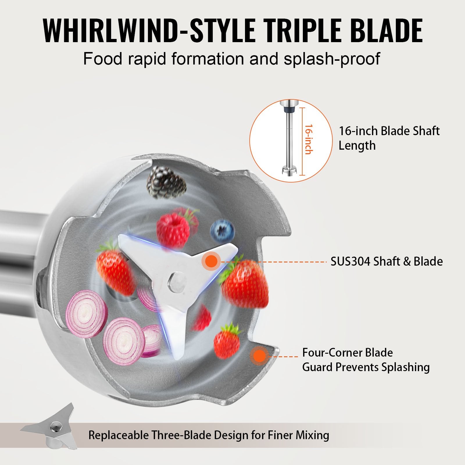 Constructed with food-grade stainless steel, durable and healthy. Features a whirlwind-style triple blade head for rapid food shaping and thorough blending. The splash-proof blade cover design prevents ingredients from splashing. Comes with replaceable blades for added practicality.