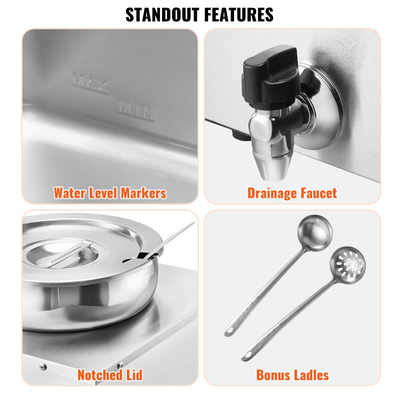 The soup pot is thoughtfully designed with water level markers inside for effortless water maintenance. The container features a faucet for draining water after use, reducing the hassle of cleaning the machine’s interior. Additionally, two extra long-handled ladles are included, perfectly suited for deep pots.