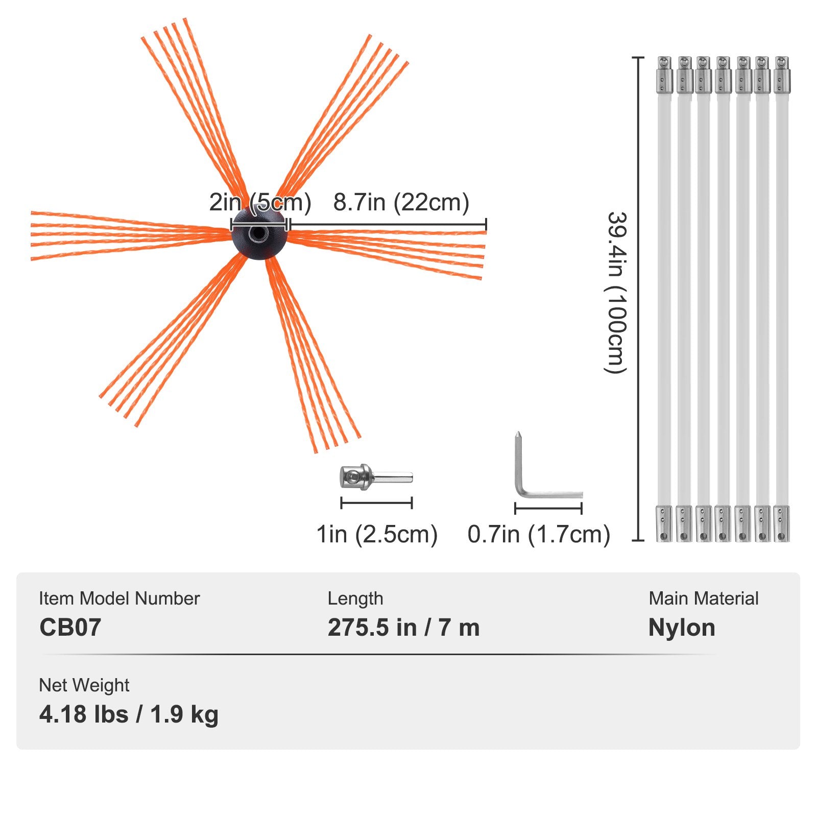 VEVOR 7 m Chimney Sweep Kit, w/ 7 Reinforced Nylon Flexible Rods, Ergonomic Chimney Cleaning Brush, 360-Degree Brush Chimney Cleaner, Rich Accessories for Fireplace Flue Home Use Fits most Pipes