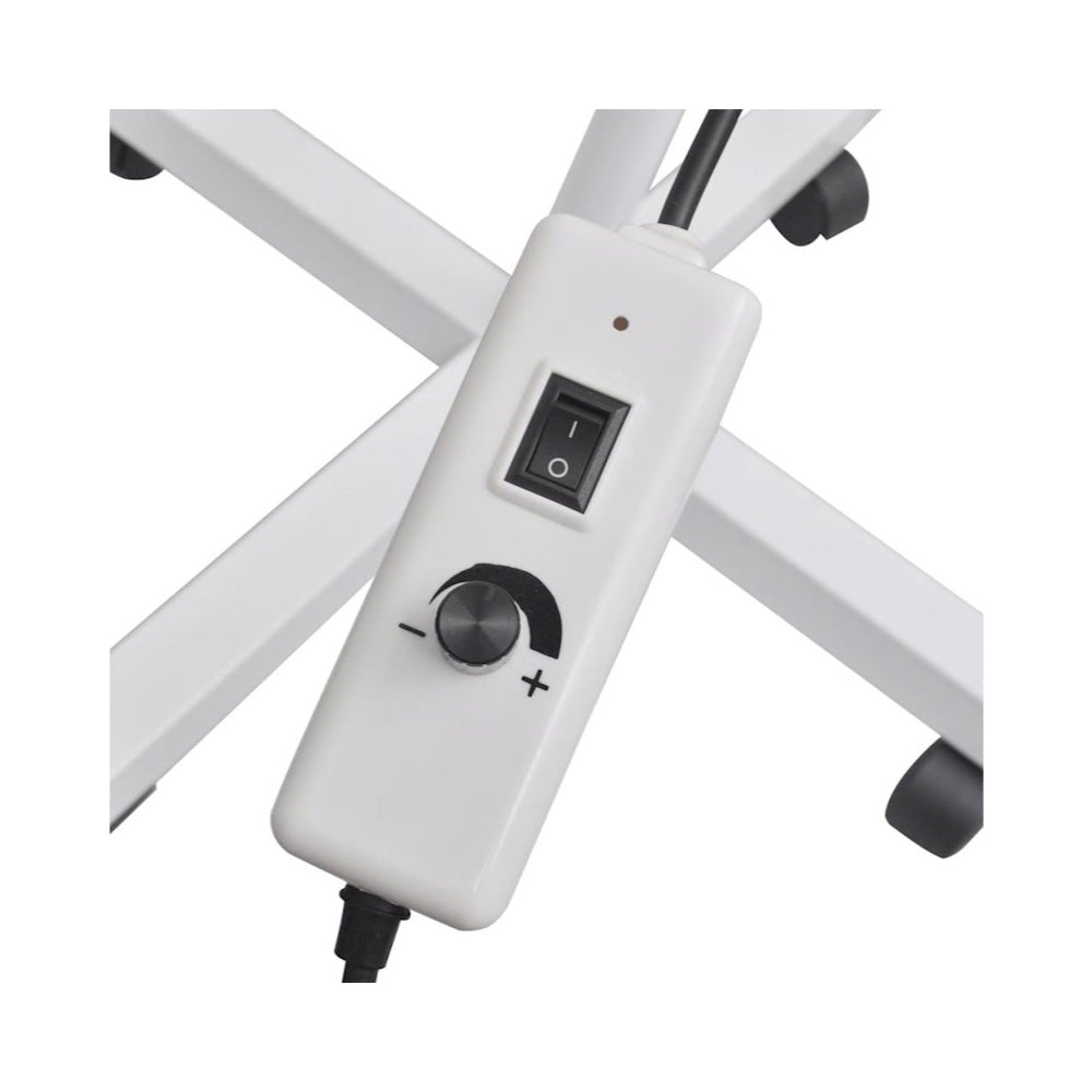 Attached dimmer to adjust lighting. Articulated arm facilitates movement and secures the lamp with total comfort. It comes with a high stability 5-wheelbase.