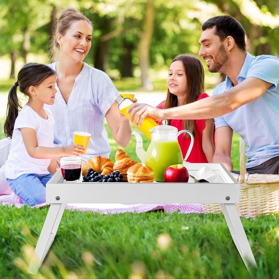 Foldable bedside table saves space and storage space: This wooden breakfast tray has legs, so it can also be used as a serving platter or bedside table. It is lightweight and portable, easy to lift and carry. Unfolded dimensions (L x W x H): 47 x 28 x 20 cm; Folded dimensions (L x W x H): 40 x 28 x 4 cm.