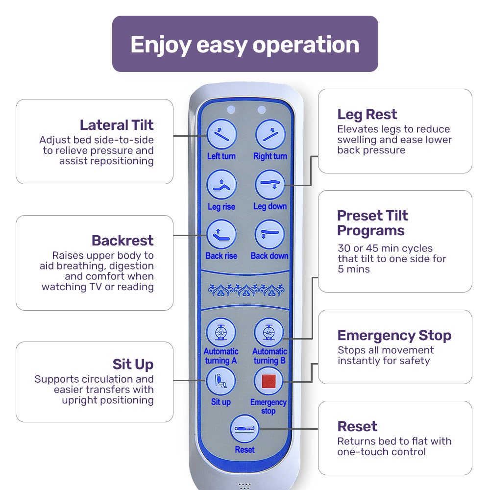 With lateral tilting, customisable adjustment, and smart support features, this bed provides dependable, dignified care.