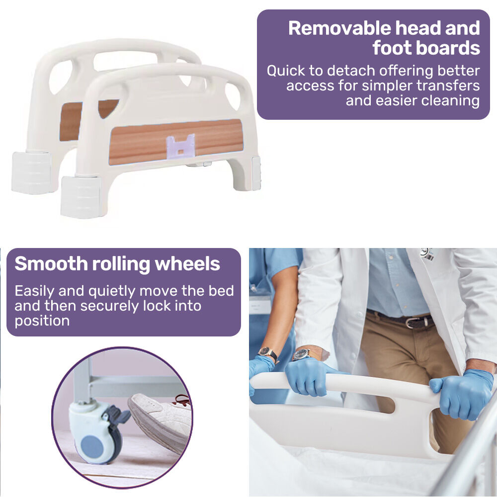 The adjustable IV pole supports essential medical care, while the 125mm castors allow for smooth movement and secure positioning. The collapsible safety side rails offer security and easy patient access, and the removable over-bed table provides a stable surface for meals , and conveniently stores on the footboard when not in use. The quick-detach head and footboards offer the option of greater access to the patient or for cleaning purposes.