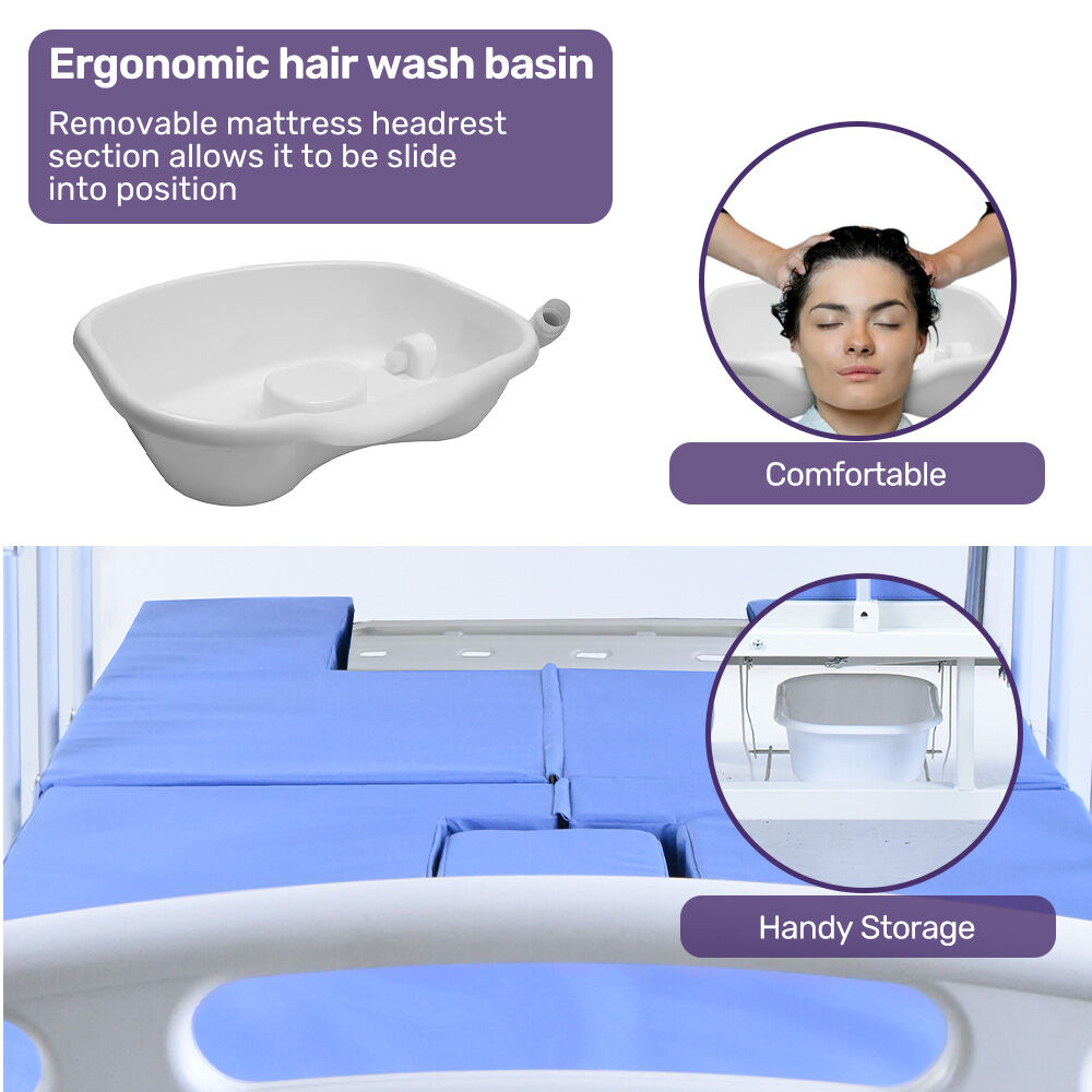 For added convenience, the bed features an integrated commode discreetly positioned beneath the mattress. A removable mattress section allows easy access, providing greater independence and dignity for patients who require toileting assistance.