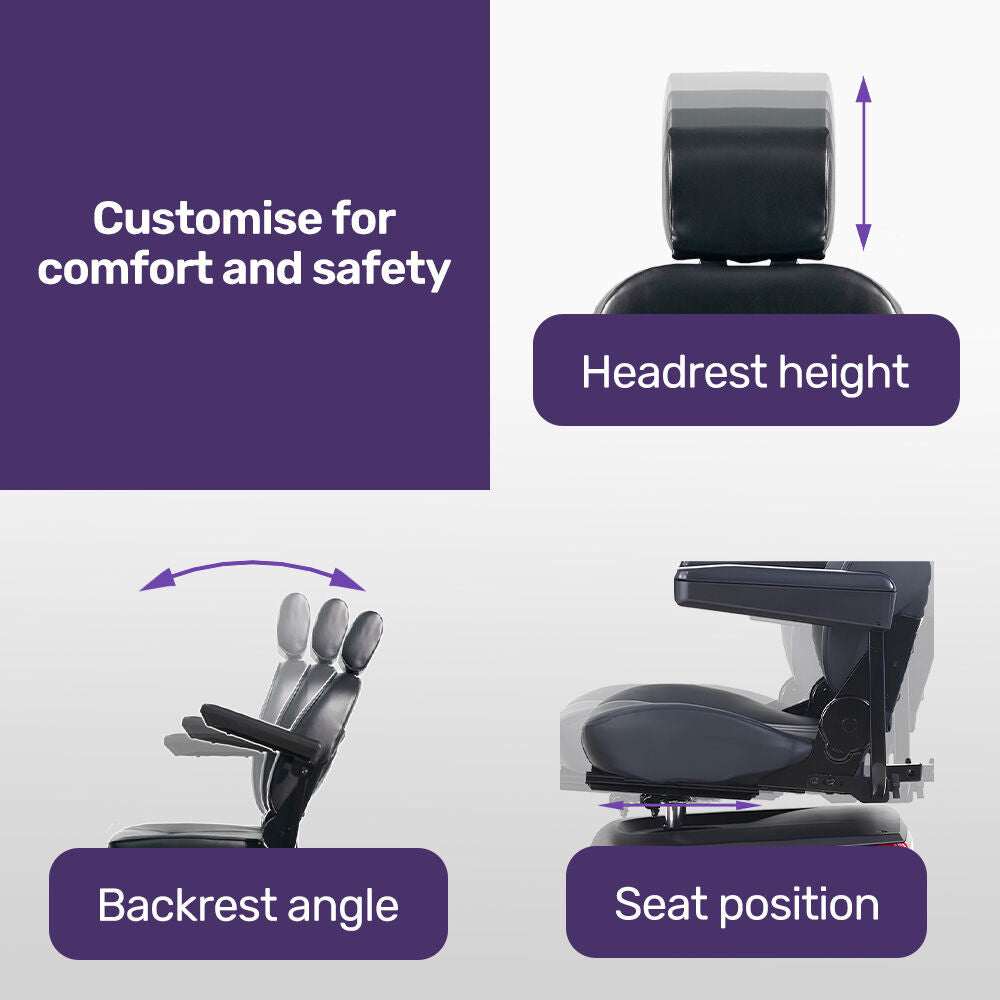 This sturdy XXXL-sized model offers a smooth, stable ride designed for comfort. With adjustable armrest width, headrest height, and seat position, you can personalise your fit for ultimate support and relaxation. Thick, cushioned padding on both the seat and armrests makes every journey a pleasure—perfect for all-day use.