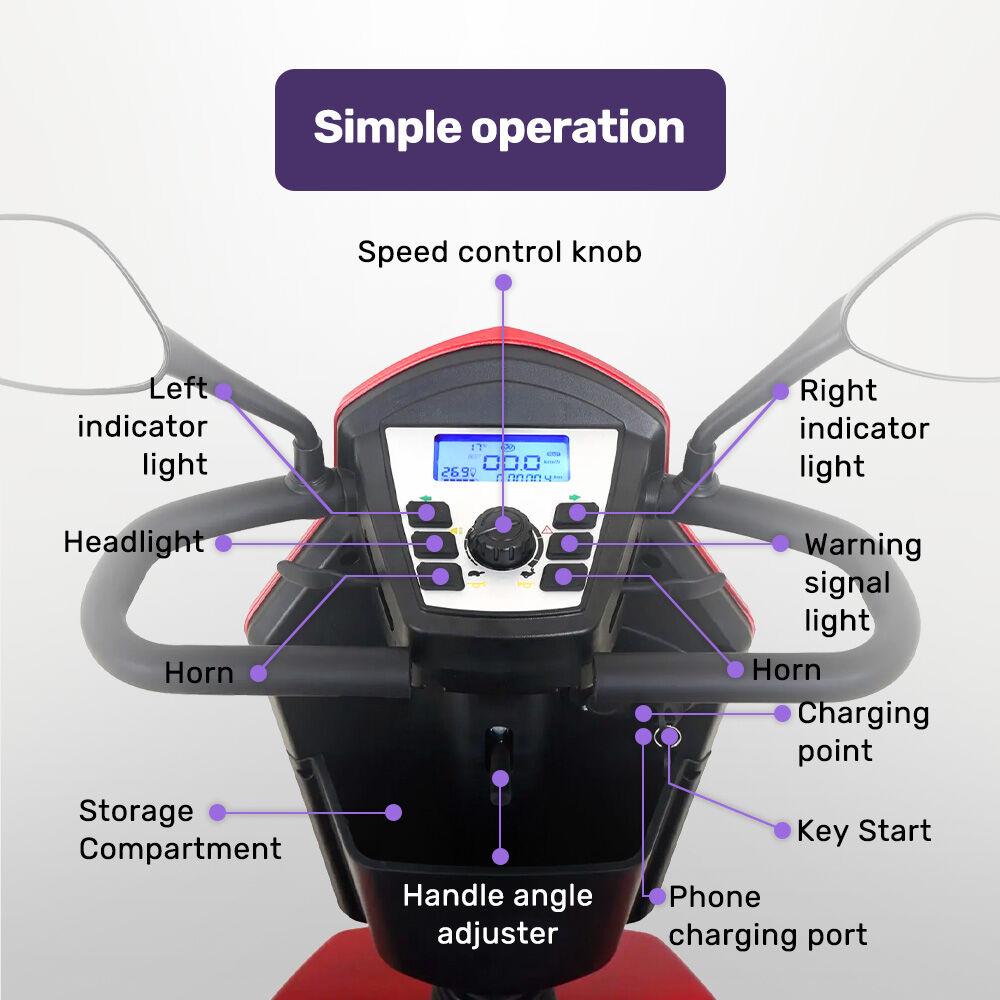 The controls are simple and intuitive, getting on and off the scooter is possible with minimal fuss as the armrests are retractable, and the comfortable seat can also swivel to the side with the pull of a lever. An easy control panel with LCD screen displays real-time trip information, including speed, distance, and battery life, keeping you informed at a glance.
