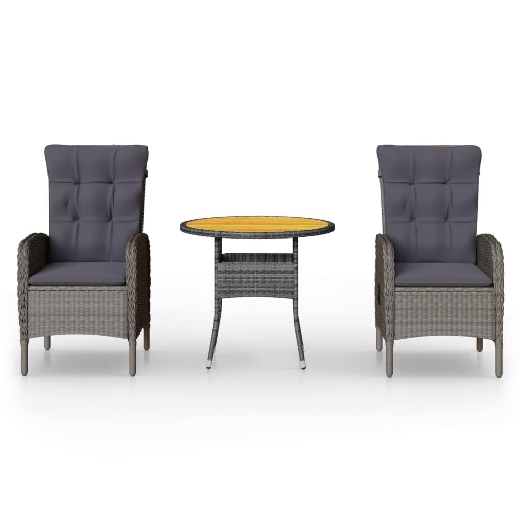 This stylish poly rattan garden bistro set is meant to be the focal point of your garden or patio. It is a great choice for al fresco relaxing in the outdoor spaces! Premium material: Sturdy steel frame wrapped with weather resistant hand woven PE rattan, this outdoor patio set is rust proof, which can provide years of quality relaxation.Stable and strong structure: The steel frames ensure sturdiness and stability.Comfortable chairs: Designed with curved backrest and armrest, the garden reclining chair has a more ergonomic shape for maximum comfort. Cushions are included for added support and the zipped cover is removable for easy washing.Gas lift mechanism: Thanks to the gas lift mechanism, the garden armchair's backrest is adjustable to fit your positions. By touching the button on the side, the backrest can recline, for a comfortable position.Lightweight construction: Thanks to the lightweight construction, the bistro table and poly rattan chairs are easy to move. Note:In order to extend the life of your outdoor furniture, we recommend you to clean it regularly and do not leave it outdoors without protection unnecessarily. Clean: Use a mild soap solution. Storing: If possible, store in a cool, dry place indoors. If the product is stored outdoors, protect it with a waterproof cover. Wipe and dry the excess water or snow from flat surfaces after a rain or snowfall. Allow sufficient air circulation to avoid moisture-related damage.