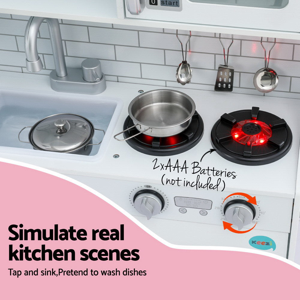 Explore imaginative play with our Keezi Wooden Kitchen Play set. Crafted from sturdy MDF and solid wood with a non-toxic paint finish, it features a smooth surface for easy cleaning. Includes cooking accessories, a fully operational oven door, turnable oven knobs, and a telephone for orders