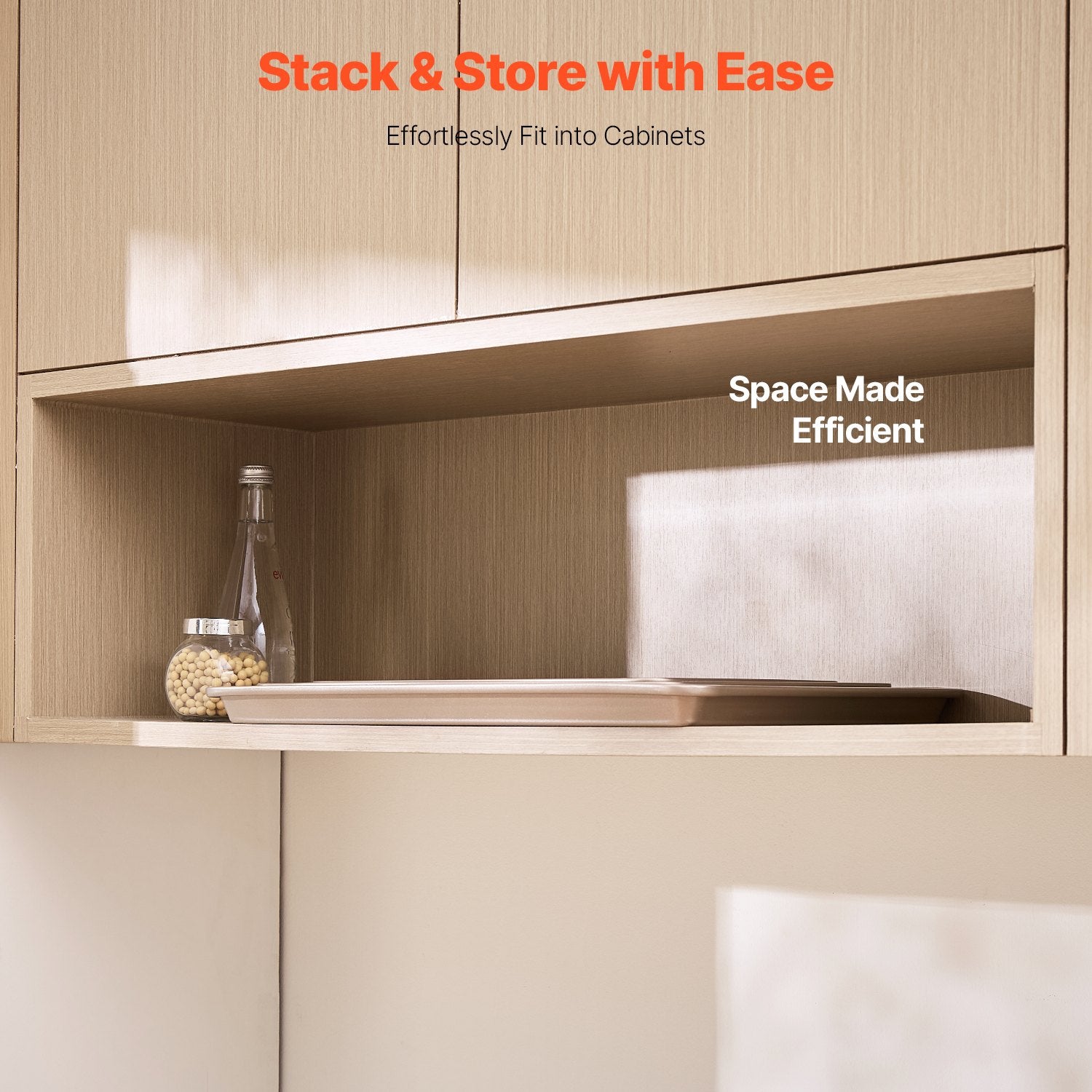 This baking sheet set is stackable, making it easy to store and saving precious kitchen space. Whether neatly tucked away in your cabinet or kitchen drawer, it stays compact and out of the way. Say goodbye to clutter and hello to organized baking with this versatile oven pan set!
