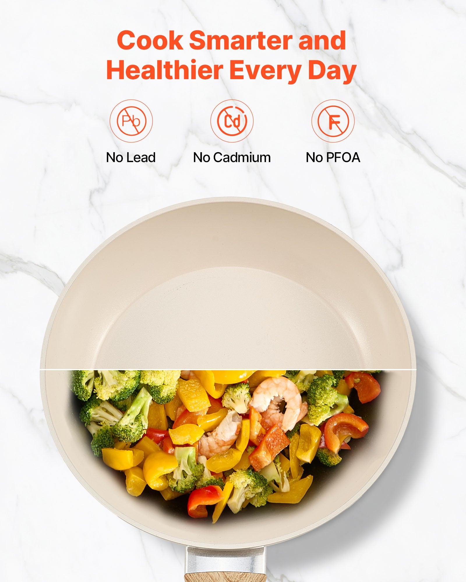VEVOR Frying Pan Skillet, Aluminum Egg Fry Pans, 3 Pcs (200, 240, 280 mm), Nonsitck Ceramic Heavy-Duty Skillets with Heat-Resistant Handle, Chef's Kitchen Cookware for Gas, Electric, Induction, Beige